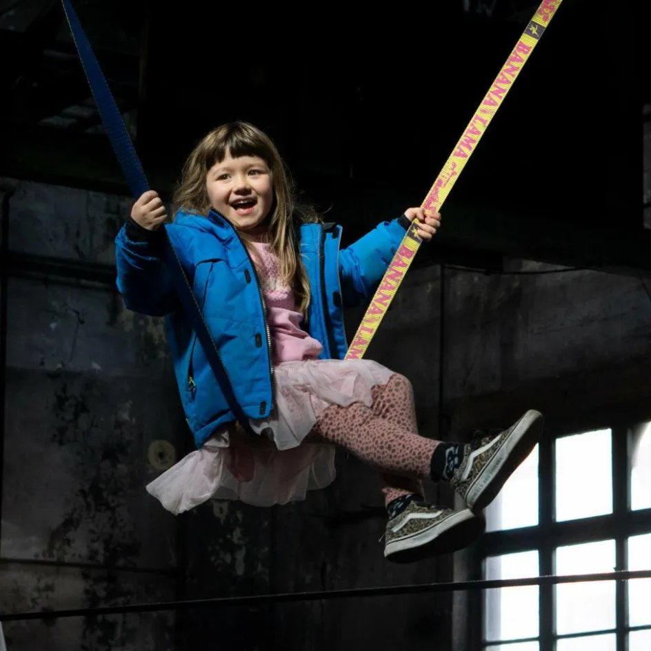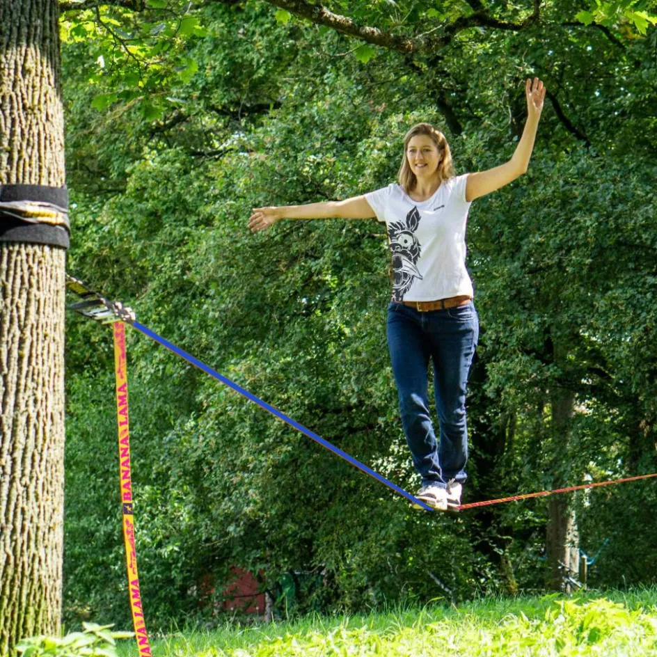 Nicht zu schmal und nicht zu breit: die BananaLama Slackline ist mit ihren 35 mm ein echter Allrounder, der sowohl EinsteigerInnen als auch Profis Spaß und Herausforderung auf 15 Metern Länge bietet!