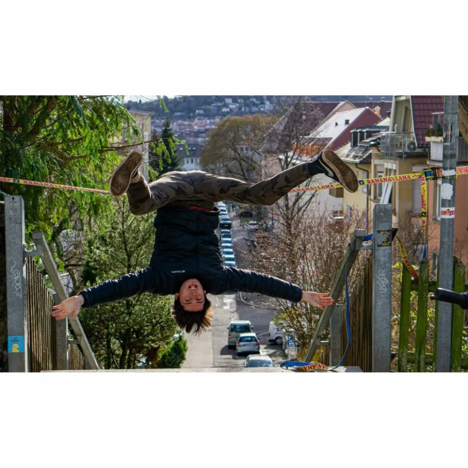 Schon bei den ersten Schritten spürst du die gute Dynamik der Slackline. Und durch die hohe Rücksprungkraft des Bandes kannst du dich bei kürzeren Abständen sogar an ambitionierten Sprüngen versuchen.