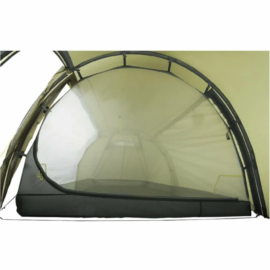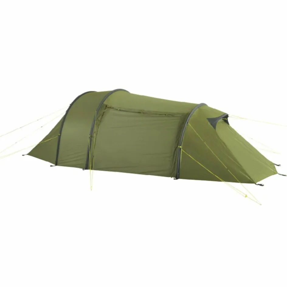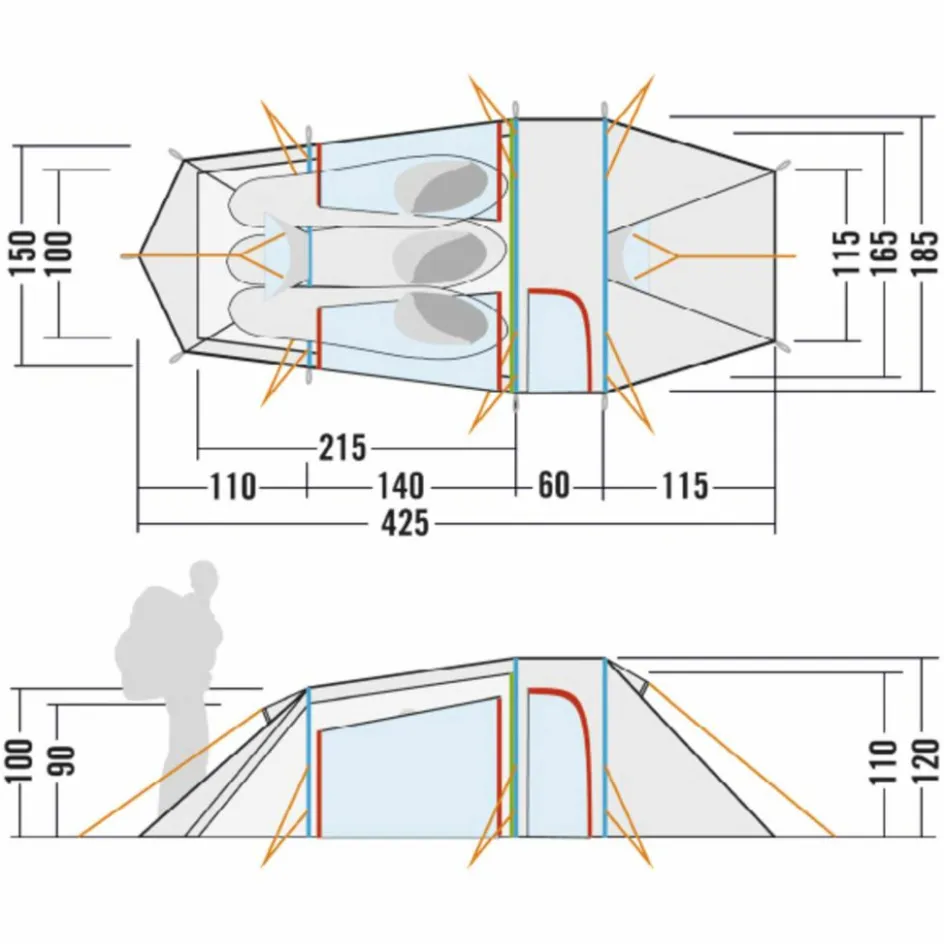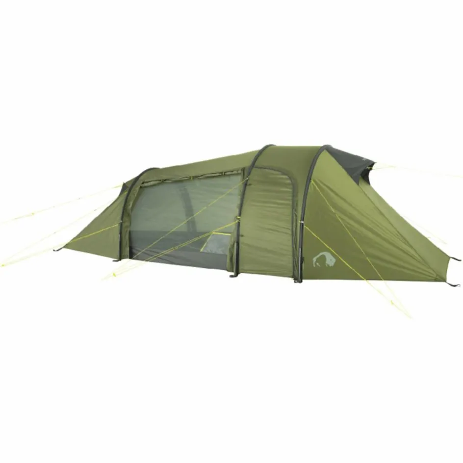Das 3-Personen-Zelt wird mit drei Gestängebögen aus leichtem, bruchfestem Aluminium aufgestellt. Der hintere Bogen ist verkürzt, wodurch Material und Gewicht eingespart werden. Durch die Koppelung von Innen- und Außenzelt gestaltet sich der Aufbau sehr einfach. Das Innenzelt kann selbstverständlich auch ausgehängt werden.