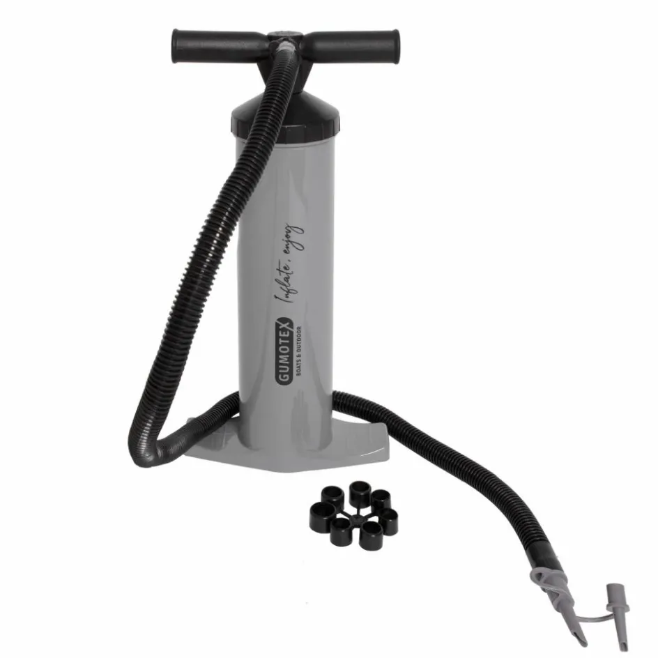 Die kompakte, leistungsstarke Handpumpe pumpt beim Drücken und Ziehen insgesamt 6 Liter Volumen (4 L / 2 L) Luft in dein Schlauchboot.