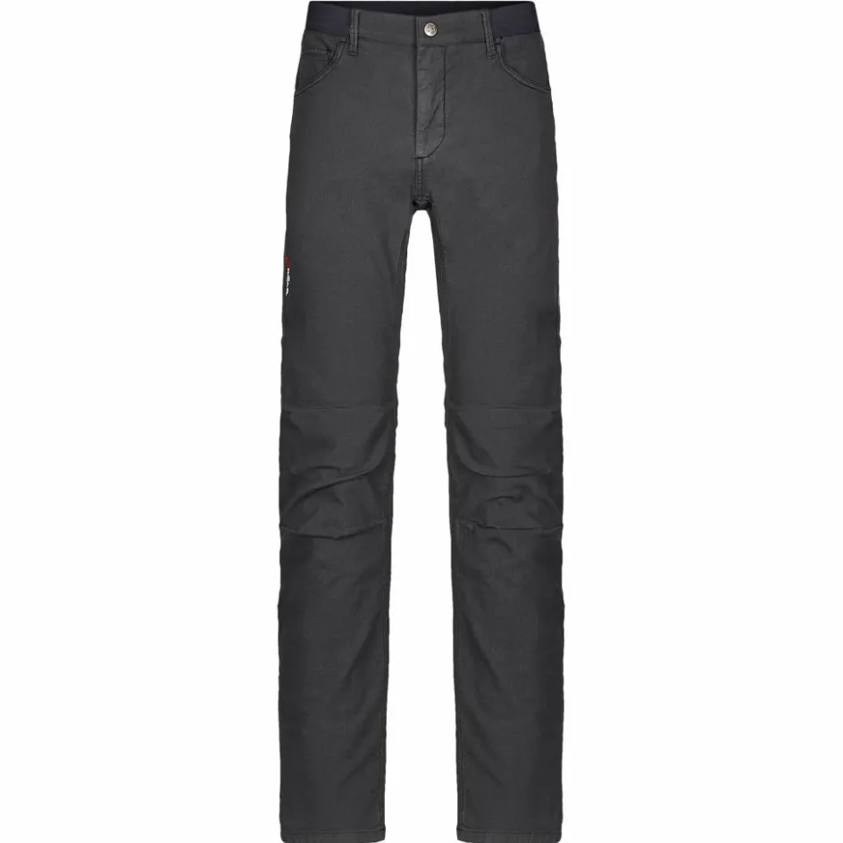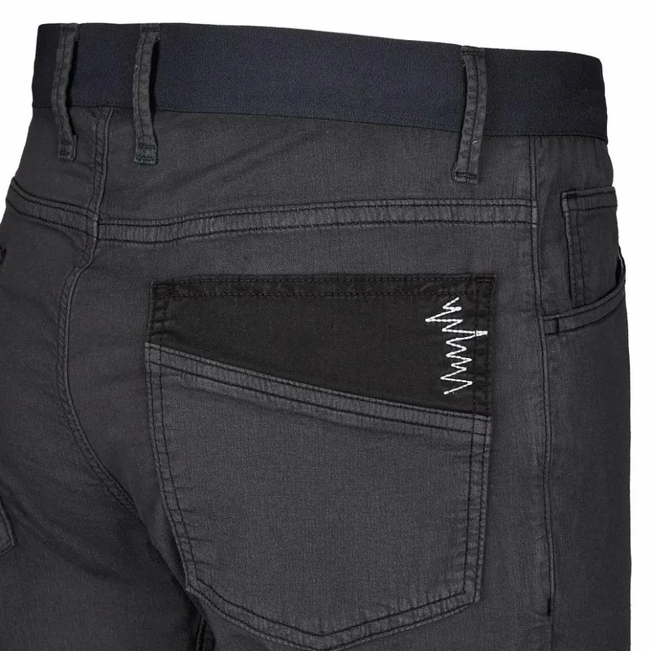 Die Hose hat den Schnitt einer klassischen Five-Pocket und wird per Knopf und Reißverschluss geschlossen. Dank des elastischen Zwickels im Schritt bietet die Hose auch bei extremen Moves absolute Bewegungsfreiheit. Die Knie sind leicht vorgeformt. Der elastische Bund ist besonders flach verarbeitet, sodass er unter dem Klettergurt nicht aufträgt.