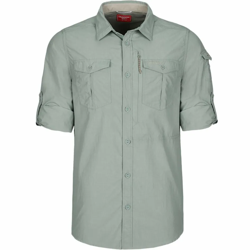 Die Ärmel des Langarmhemds lassen sich ganz einfach zum Kurzarm aufrollen und mit Lasche und Knopf fixieren. Der klassische Kragen kann zum Schutz vor der Sonne doppelt ausgeklappt werden. Für Stauraum sorgen einige Taschen. Eine lässt sich sogar durch einen kleinen Karabinerhaken verschließen.