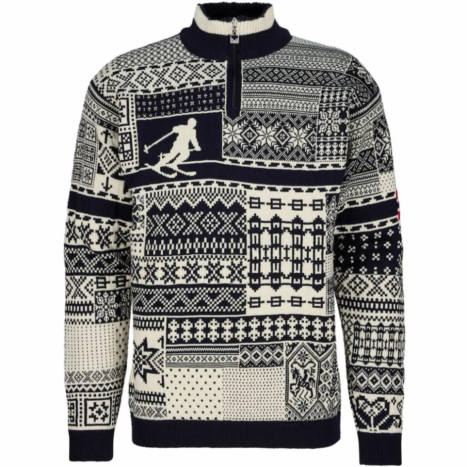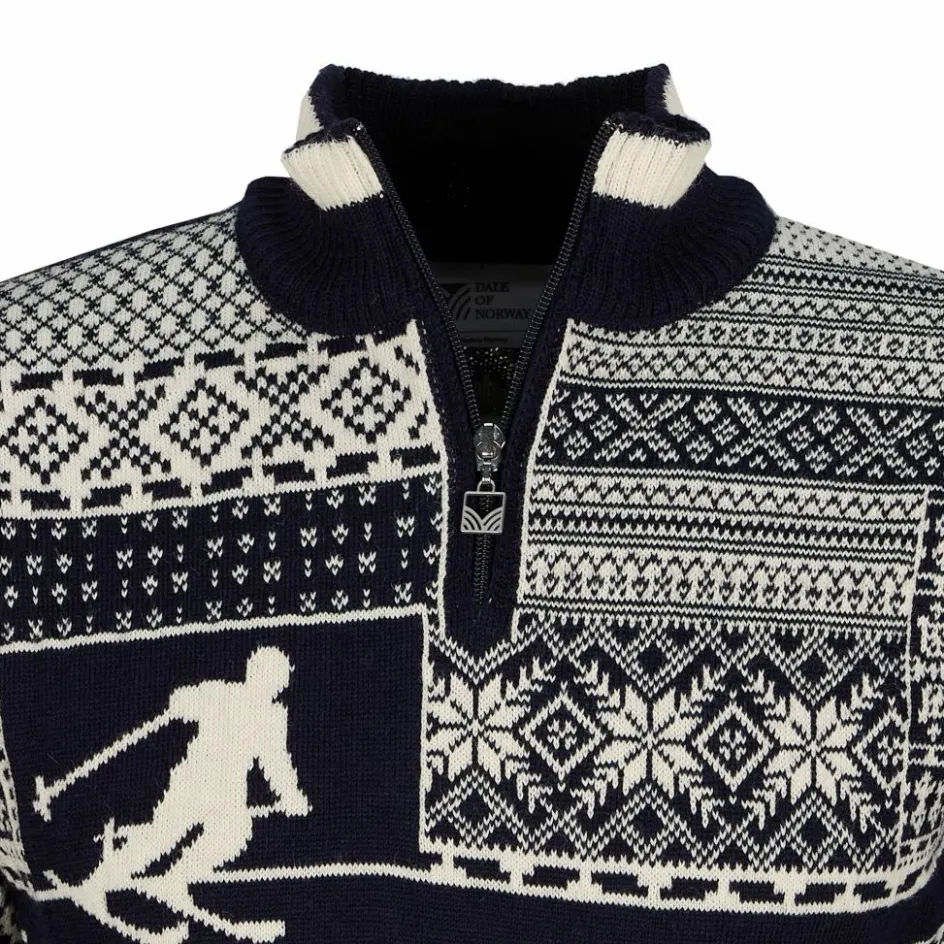 Der kurze Stehkragen ist mit weicher Merinowolle gefüttert und schenkt in den ruhigen Momenten Behaglichkeit. Der viertellange Reißverschluss hingegen sorgt für individuelle Belüftungsmöglichkeiten. Dale of Norway stellt seit 1956 die offiziellen Wollpullover für das norwegische Olympiateam. In diesem Sweater vereinen sich die Designs aller 18 Teampullovern der vergangenen Spiele.