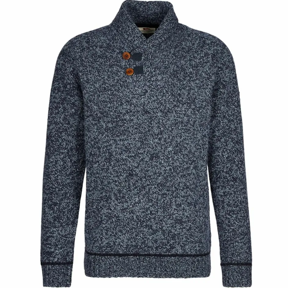 Der Lada Sweater ist ein klassischer Strickpullover aus weichem Lammwollgemisch. Er hat einen schmeichelnden Schalkragen, der vorne mit zwei Knöpfen aus Steinnuss geschlossen wird.