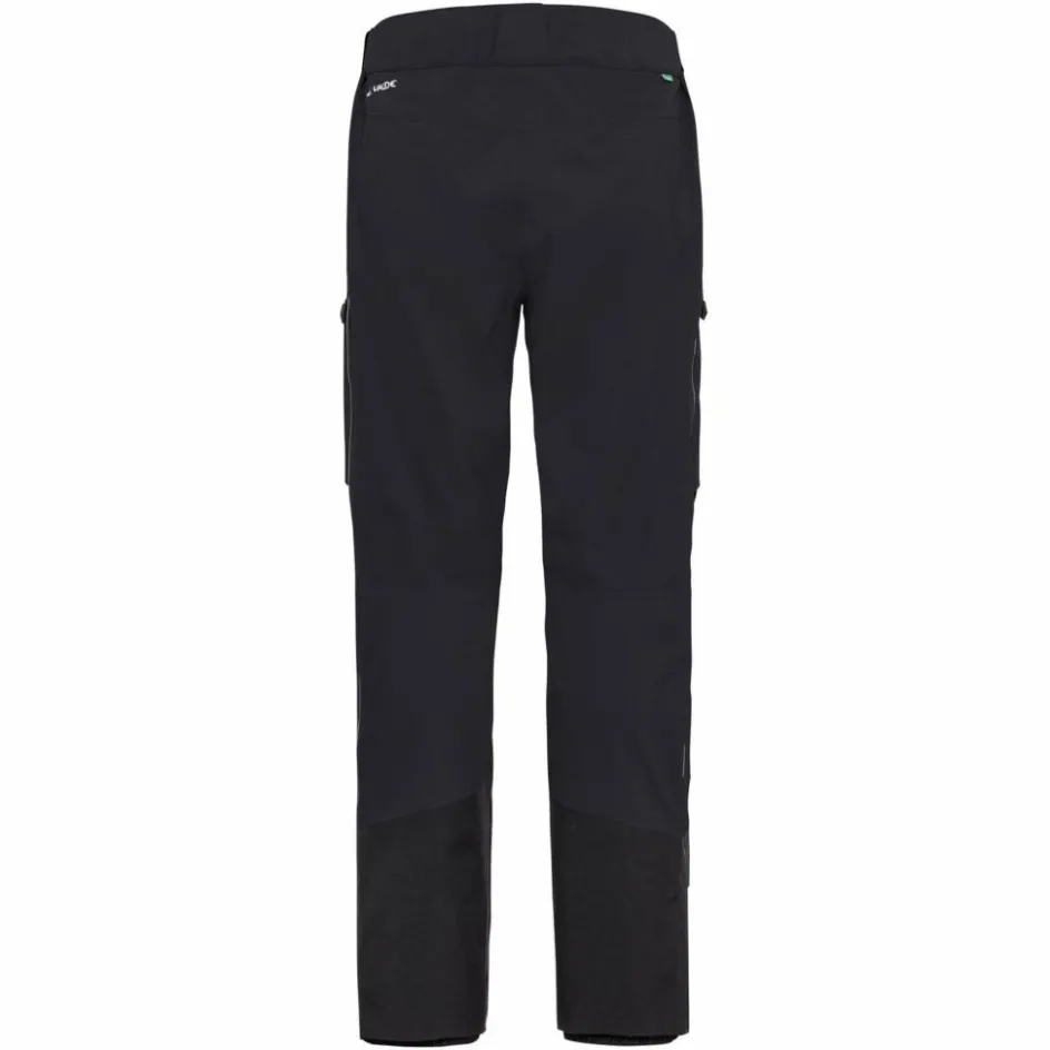 Der Bund ist weitenverstellbar und mit Gürtelschlaufen versehen, der Rückenteil etwas höher geschnitten, damit auch mit angezogenen Beinen am Fels oder in gebückter Haltung keine Kältebrücke entsteht. Die beiden Beintaschen mit wasserdichtem Reißverschluss verwahren Handy, Mütze oder den Müsliriegel und sind auch bei angezogenem Klettergurt gut erreichbar. Der Beinabschluss ist großzügig mit robustem, schnittfestem Material verstärkt, die Innengamaschen schützen vor eindringendem Pulverschnee bei der Abfahrt und die Verstellung am Beinabschluss passt über jeden Skitourenstiefel.