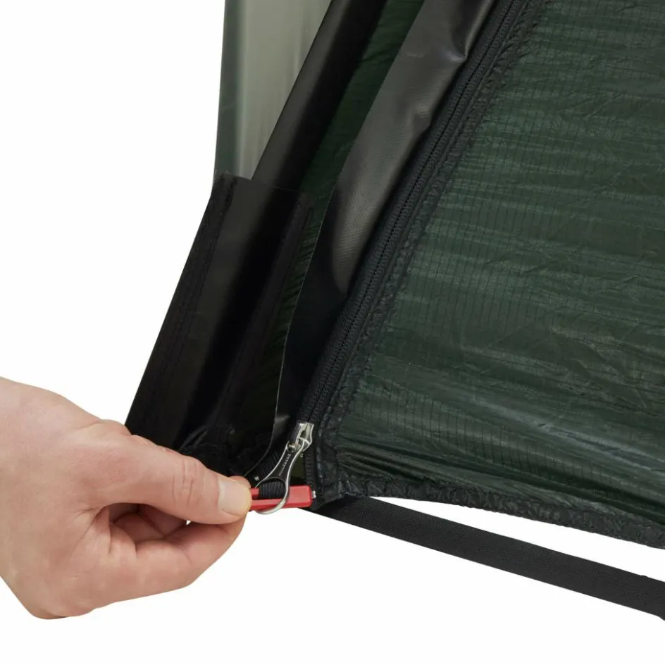 Alle drei Gestängebögen werden mit Clips am Außenzelt befestigt, was die Aufbaugeschwindigkeit erheblich erhöht. Die Featherlite-Gestänge sind gleich lang und kreuzen sich in der Kuppel, wodurch du keine Zeit mit der Suche nach der richtigen Stange verlierst. Das Innenzelt kann eingehängt bleiben und wird dadurch gleichzeitig mit dem Außenzelt aufgestellt. Bei Regen steht dir somit immer ein trockener Innenraum zur Verfügung.