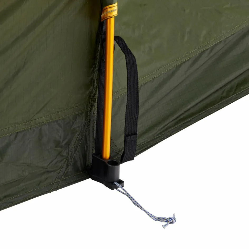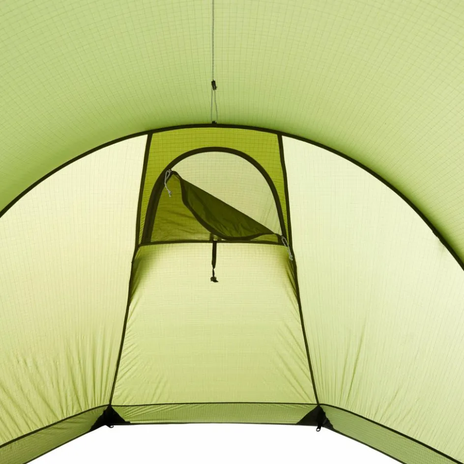 Das Innen- und Außenzelt kann gleichzeitig aufgestellt werden. So bleibt das Innenzelt bei Regen trocken und die Aufbauzeit wird verkürzt. Alle Gestängekanäle sind farblich markiert und so bemessen, dass bei starkem Sturm oder viel Schnee ein zweiter Stangensatz (als Zubehör erhältlich) eingezogen werden kann.