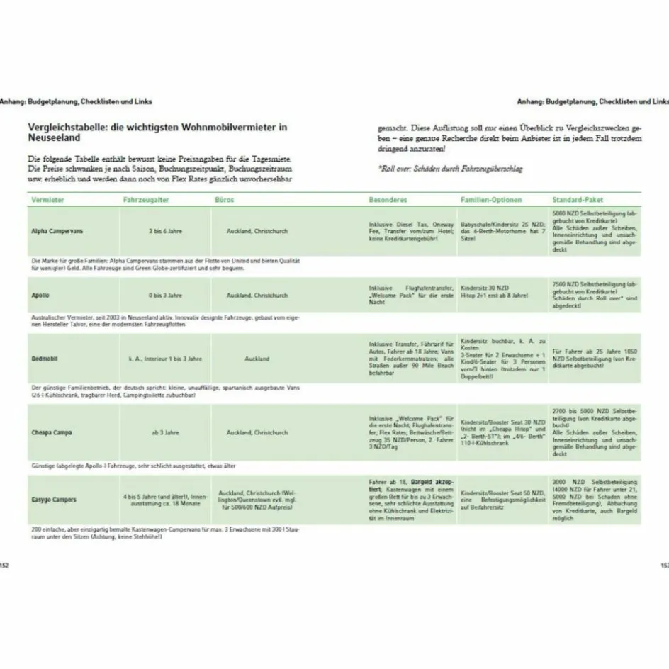 Als Dach der Sternenhimmel ein Ratgeber voller Fakten und Tipps rund um das Wohnmobil-Reisen in Neuseeland. Die wichtigsten Fragen vor einer Neuseeland-Reise werden beantwortet: Wo finde ich ein Wohnmobil, das genau meinen Bedürfnissen entspricht? Wie kaufe ich einen gebrauchten Campervan? Wie schwierig ist das Fahren in Neuseeland? Was sind die schönsten Routen? Wie sehen die neuseeländischen Campingplätze aus? Ist Freedom Camping in Neuseeland (noch) erlaubt? Was muss ich für einen Wohnmobil-Urlaub einpacken? In einem Special werden zudem die besonderen Anliegen und Fragen von Familien mit (kleinen) Kindern mit viel persönlicher Erfahrung beantwortet. Zahlreiche praktische Checklisten zum Kopieren, Tabellen und Web-Links zum Nachschlagen machen das Buch zum unverzichtbaren Reisebegleiter für alle Campervan-Enthusiasten, die das schönste Ende der Welt entdecken wollen. 2. Auflage.