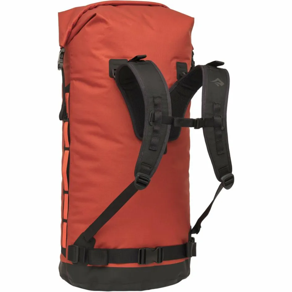 Damit der Packsack bequem am Rücken sitzt, ist er mit gepolsterten Schultergurten sowie einem verstellbaren Brust- und Bauchgurt ausgestattet. Durch den Hypalon-Rollverschluss, die canvasartige Gewebestruktur und mehrere Tragegriffe an den Seiten ist er auch im feuchten Zustand sehr gut zu greifen. Das Ripstop-Material ist äußerst robust und abriebfest. Die Nähte sind doppelt genäht und nahtversiegelt.