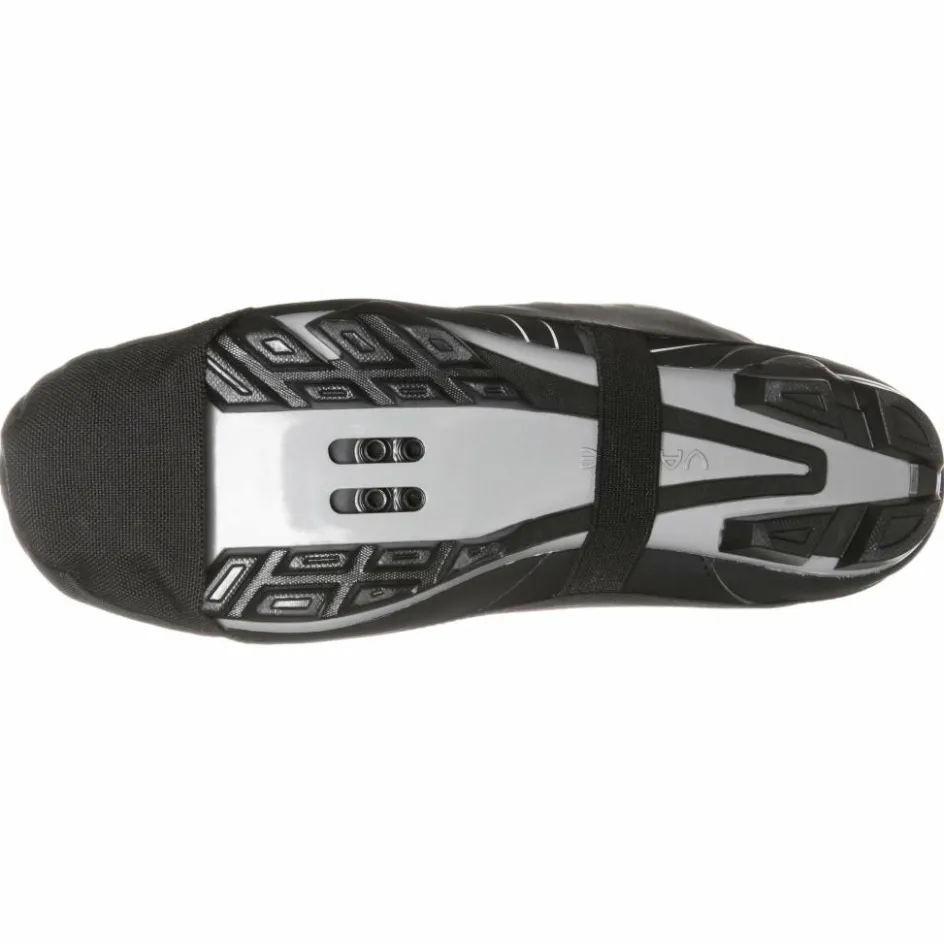 Die Überschuhe sind mit einem durchgehenden Klettverschluss an der Rückseite ausgestattet, wodurch du sie bei Bedarf einfach überziehen kannst. Die Sohle ist, von der Fußspitze abgesehen, offen. Ein Gummi unter dem Mittelfuß hält die Überschuhe in Position. Der Klettverschluss auf dem Spann dient zur Weitenanpassung. Für Schuhe mit SPD-Cleats geeignet.