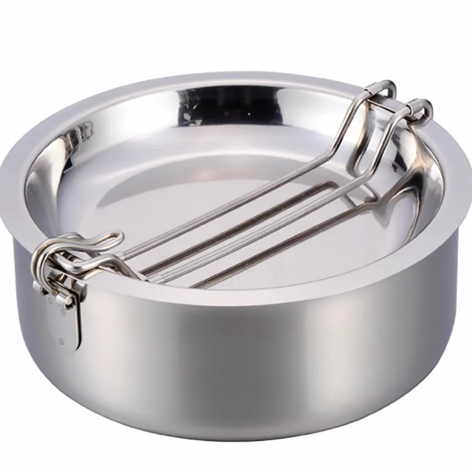 Das Kochset aus Edelstahl überzeugt durch das kompakte Packmaß und den sicheren Schnappverschluss zum Transport. Pfanne und Deckel werden dafür einfach in den Topf gestapelt.