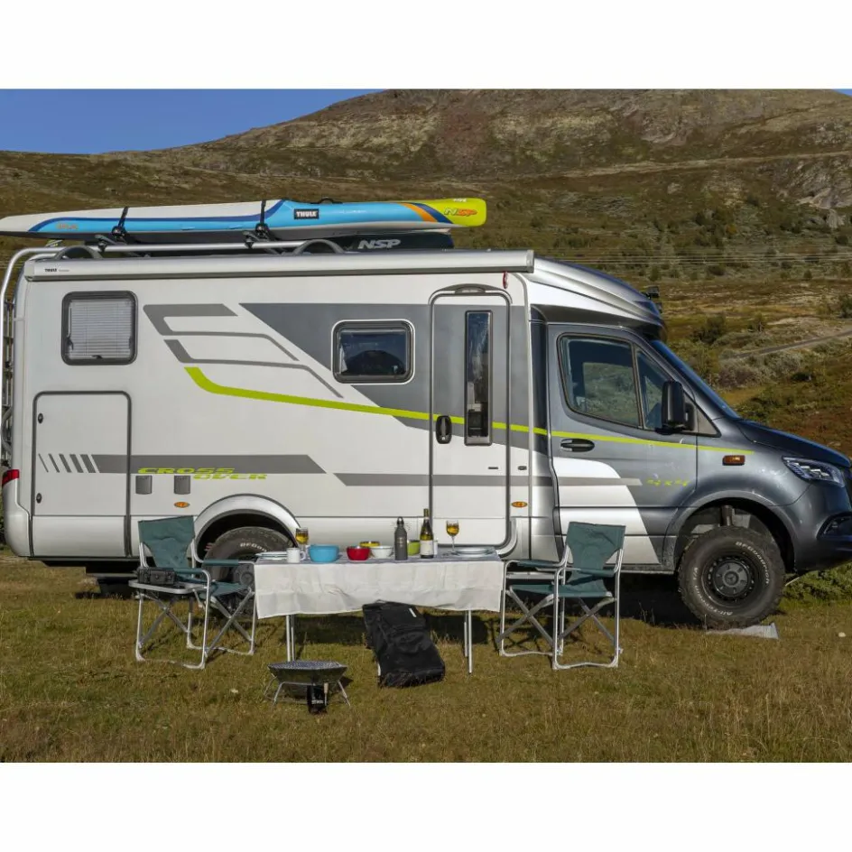 Grill aus beschichtetem Carbonstahl und mit verchromtem Grillrost. Durch herausnehmbare Einsätze auch über offenem Feuer und als Feuerschale verwendbar.