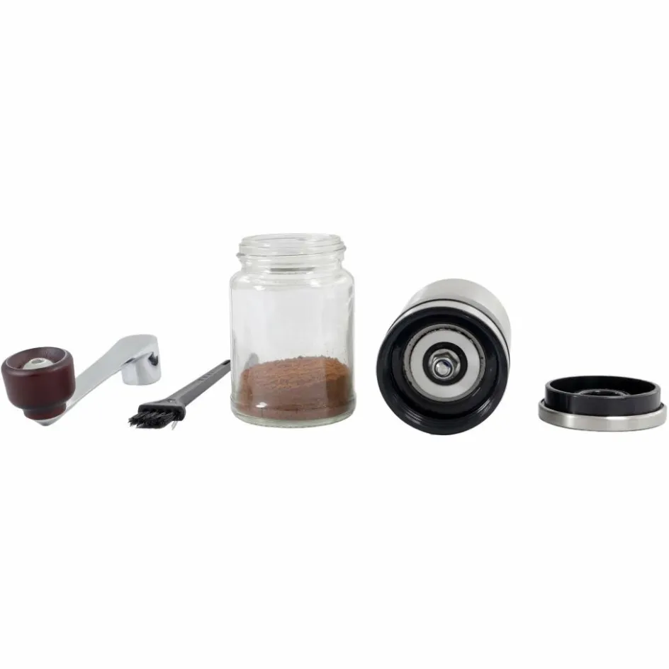 Diese Kaffeemühle mit abnehmbarer Kurbel ist perfekt für Reisen mit kleinem Gepäck geeignet. Der Mahlgrad ist in sechs Stufen einstellbar. Ausgestattet ist sie mit einem Keramikmahlwerk.