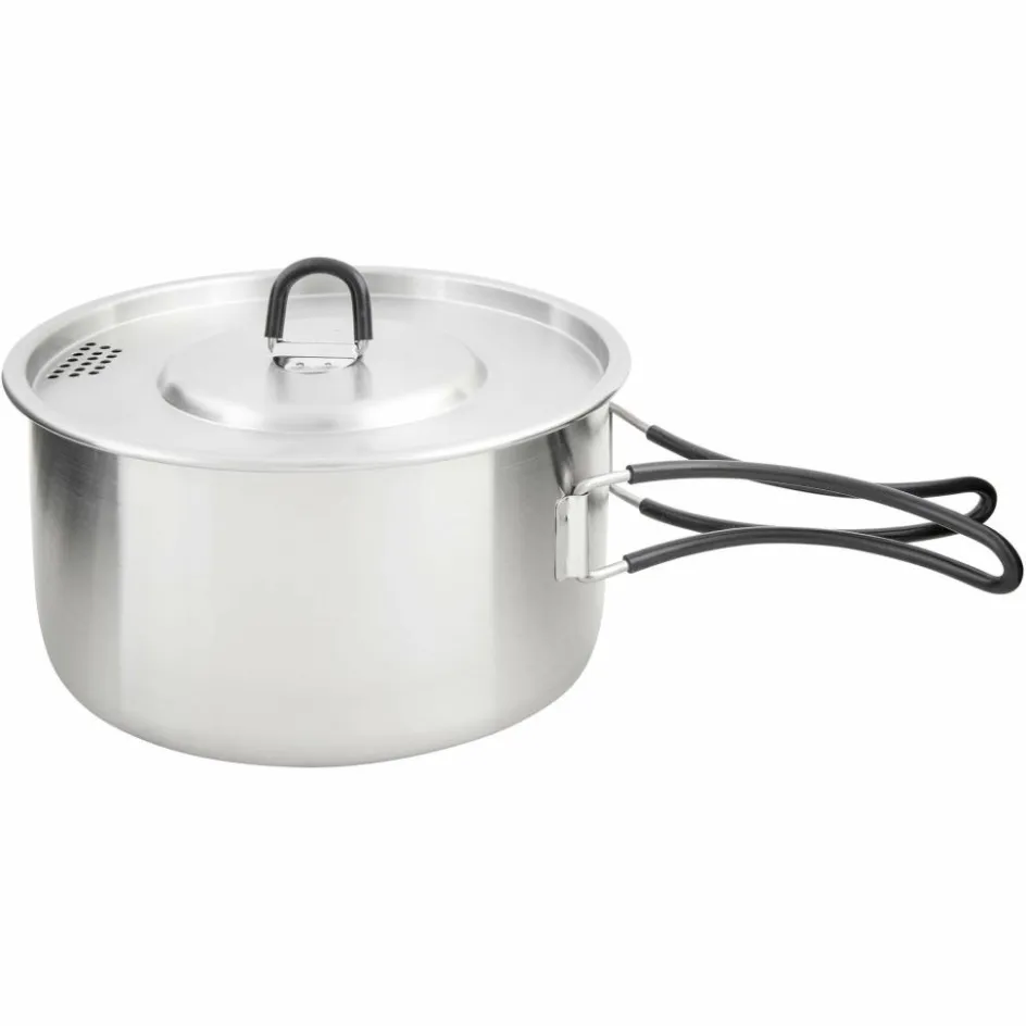 Dieses Edelstahl-Topfset bietet zwei Töpfe mit 1,6 Litern und 2,5 Litern Volumen. Die Töpfe sind aus robustem Edelstahl gefertigt und können auf allen Campingkochern verwendet werden.