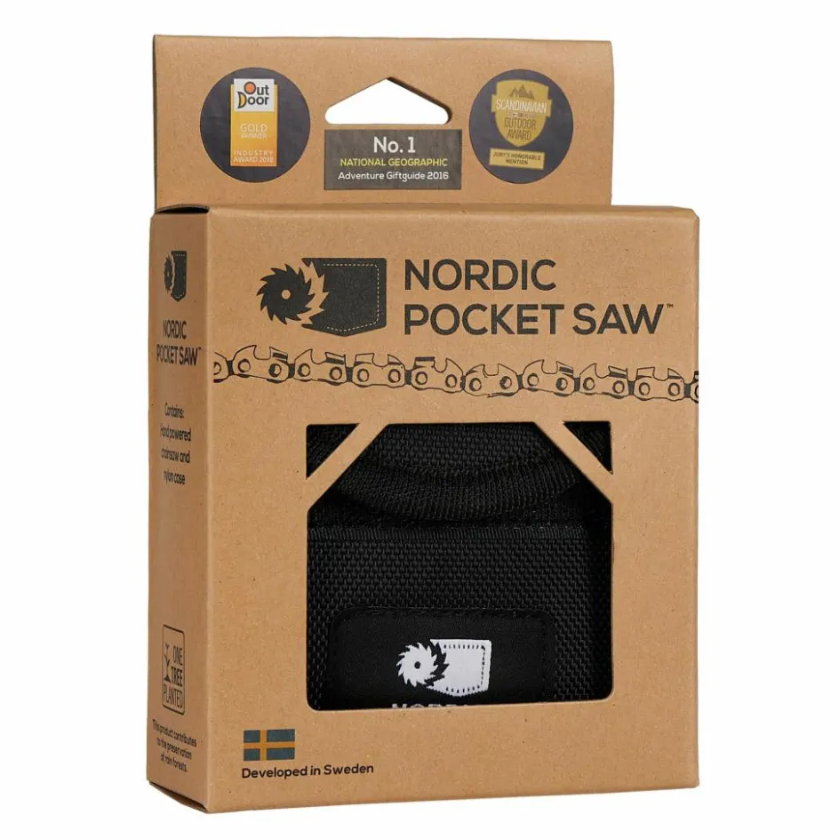 Leicht, effizient und bissig. Die Nordic Pocket Saw ist eine klein verpackbare Handkettensäge, die mit ihren 33 extra gehärteten Zähnen auch dickere Äste klein bekommt.