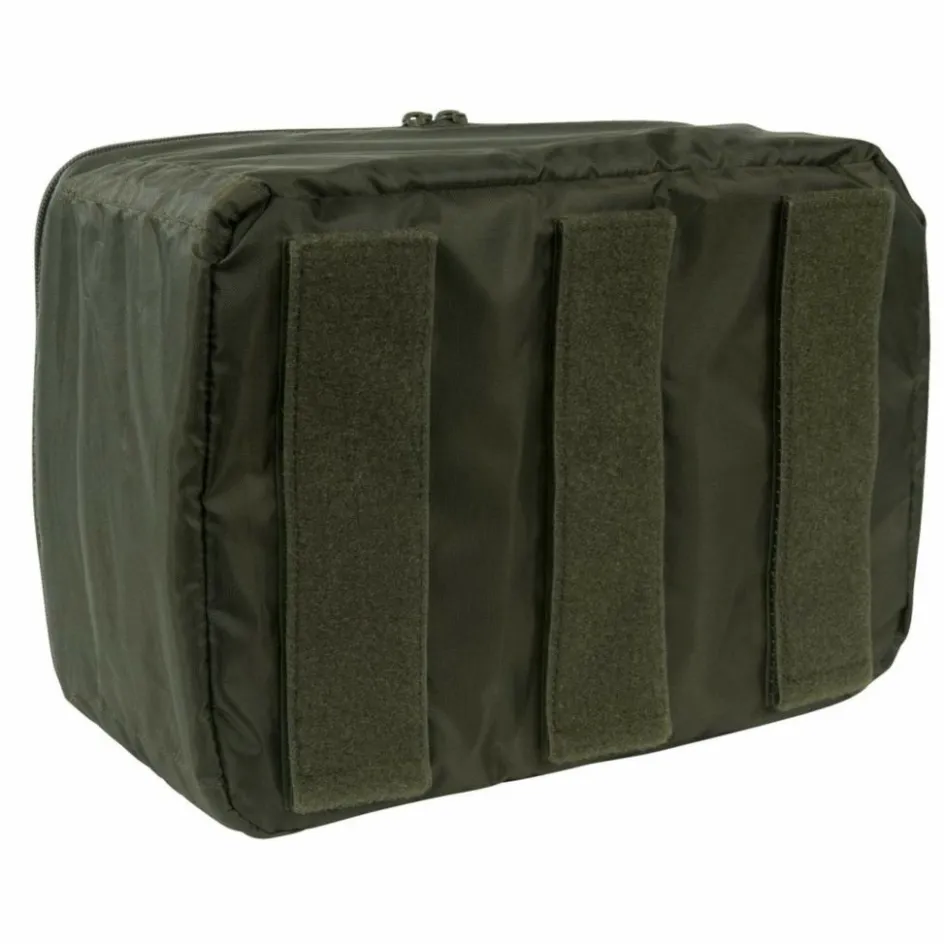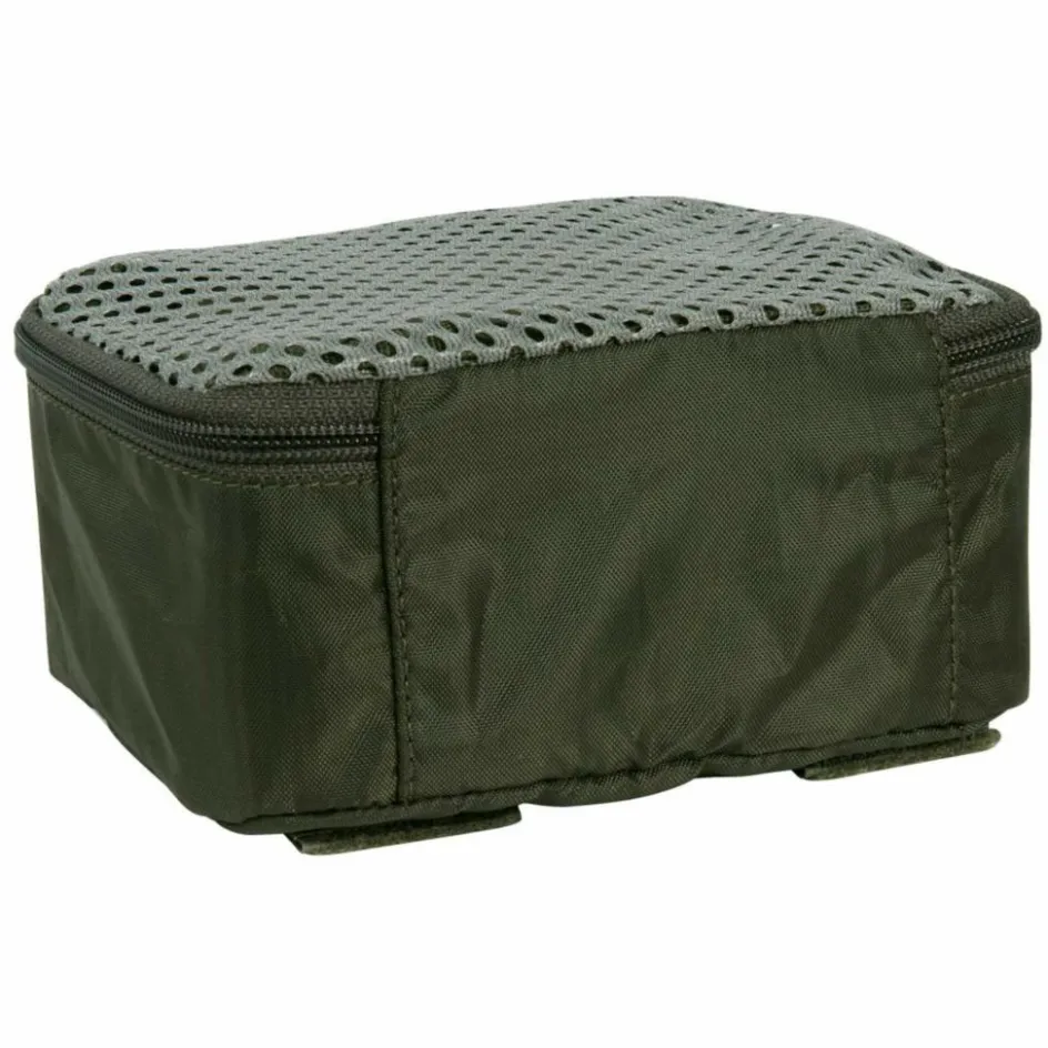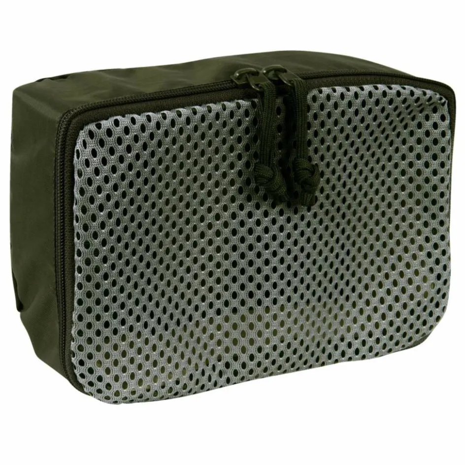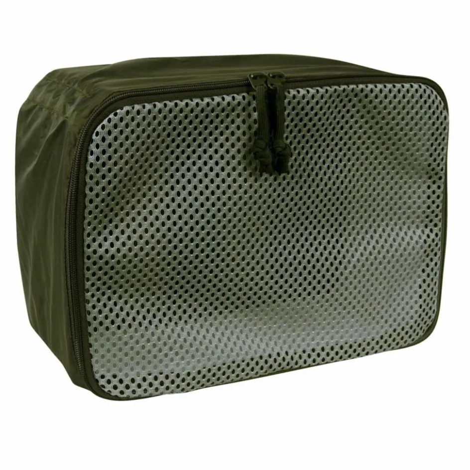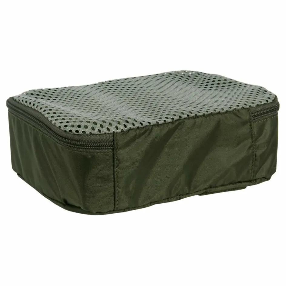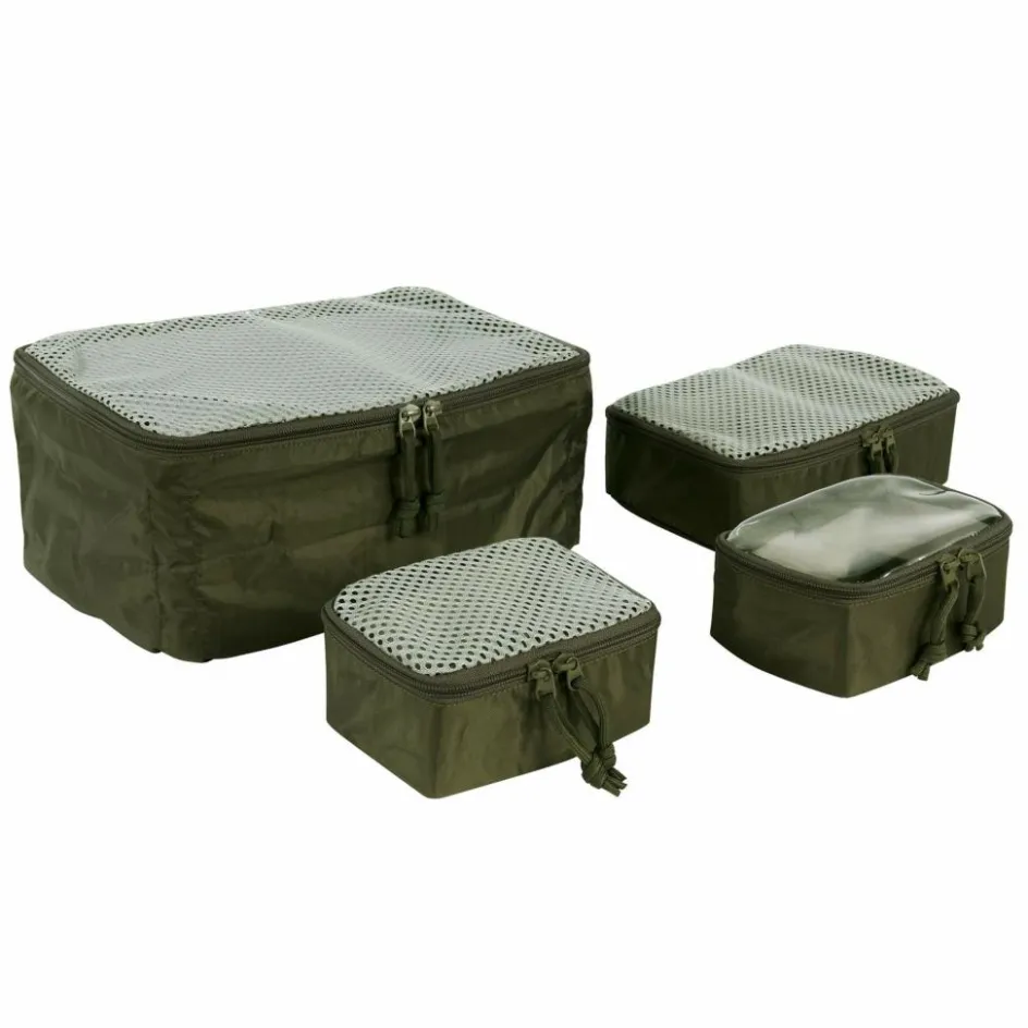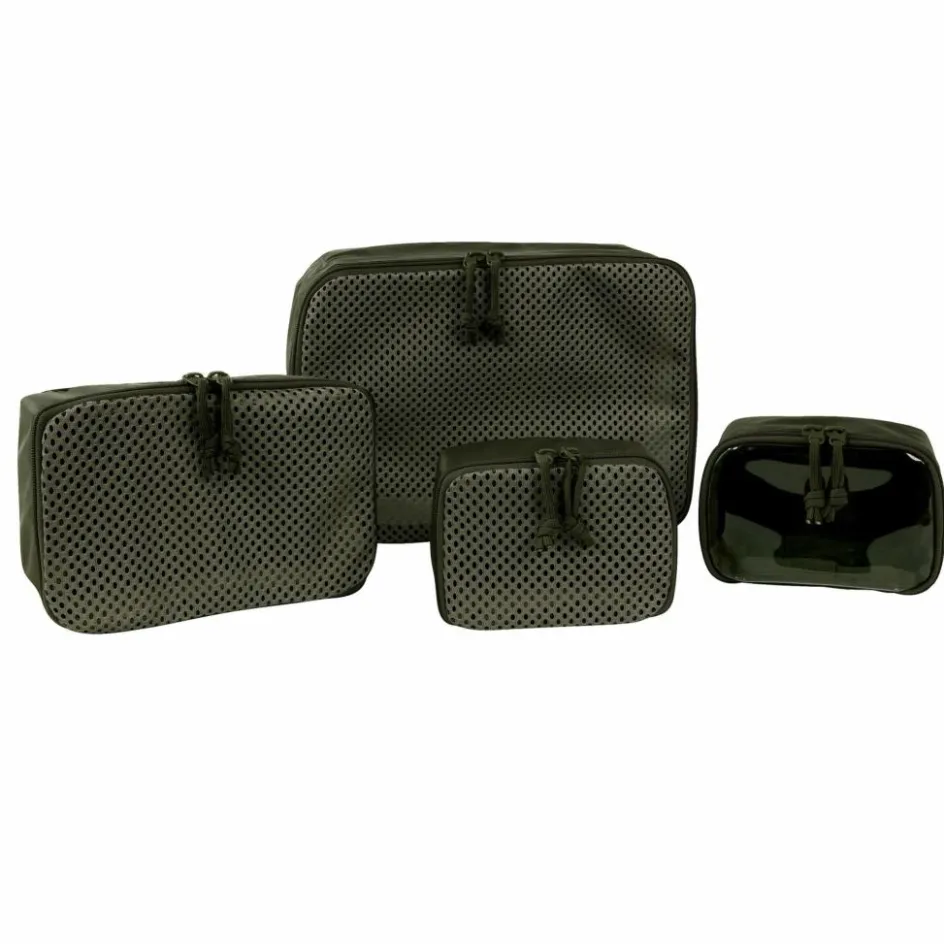 Eine Tasche des Sets in der Größe S hat einen Vinyldeckel, alle anderen Taschendeckel sind aus Netzmaterial. Die größte Netztasche ist komprimierbar.