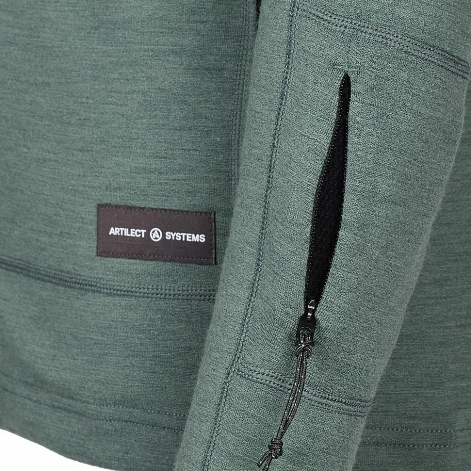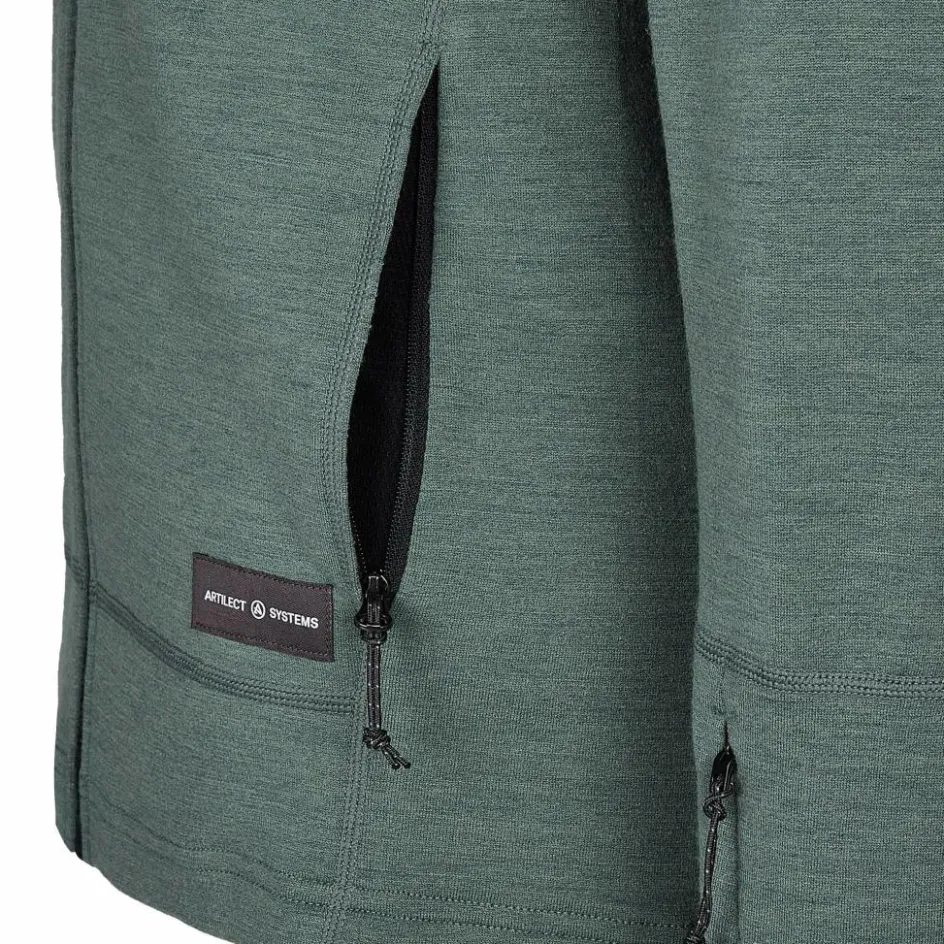 Der Hoodie ist aus Nuyarn hergestellt. Dabei handelt es sich um ein Garn aus feiner Merinowolle, die in einem besonderen Spinnverfahren mit einem Kern aus Nylon versehen wurde. Nuyarn trocknet fünfmal schneller als reine Merinowolle, ist sehr strapazierfähig und hoch elastisch. Gleichzeitig blieben die feuchtigkeitsleitenden, temperaturregulierenden und geruchshemmenden Eigenschaften, die Wolle von Natur aus besitzt, erhalten. So sorgt der Hoodie bei verschiedenen Aktivitätsleveln für volle Bewegungsfreiheit und ein angenehmes Körperklima.