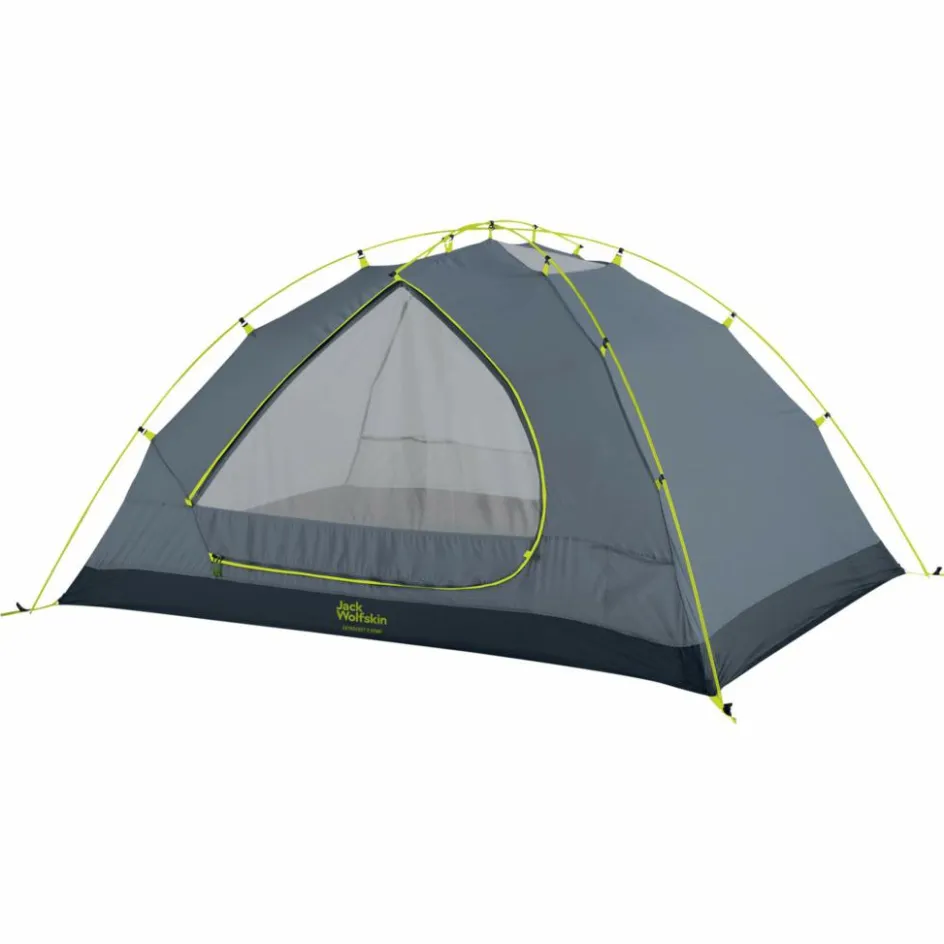 Die Belüftung erfolgt über die beiden Hochlüfter, die mit einem Reißverschluss verschlossen werden können. Kommen Wind und Regen zusammen, drückt dieser gerne Regentropfen durch die Lüftung ins Zelt. Jack Wolfskin hat daher vorgesorgt und eine Regenschutzleiste eingearbeitet, die die Tropfen bereits vorher ableiten.