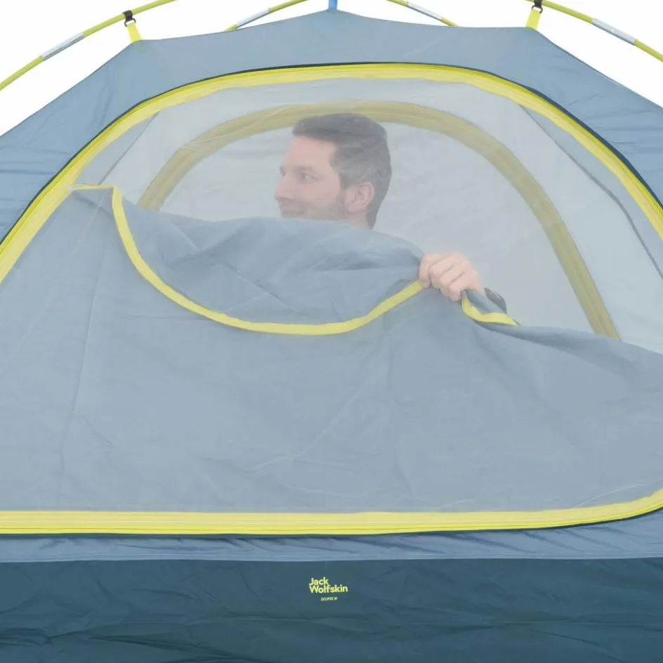 Beim Design des Eclipse III wurde auf viel Komfort Wert gelegt. So finden sich zwei Apsiden mit jeweils einem Eingang – praktisch, um Ausrüstung übersichtlich zu verstauen. Zudem kommt man sich beim Ein- und Ausstieg nicht in die Quere. Der Innenraum ist dank vier Belüftungsöffnungen angenehm klimatisiert. Auch sitzen kannst du im Eclipse ganz bequem durch seine 120 cm Innenhöhe. Natürlich ist das PU-beschichtete Polyester-Material komplett wasserdicht – so lassen sich Regentage gut in diesem Zelt verbringen.