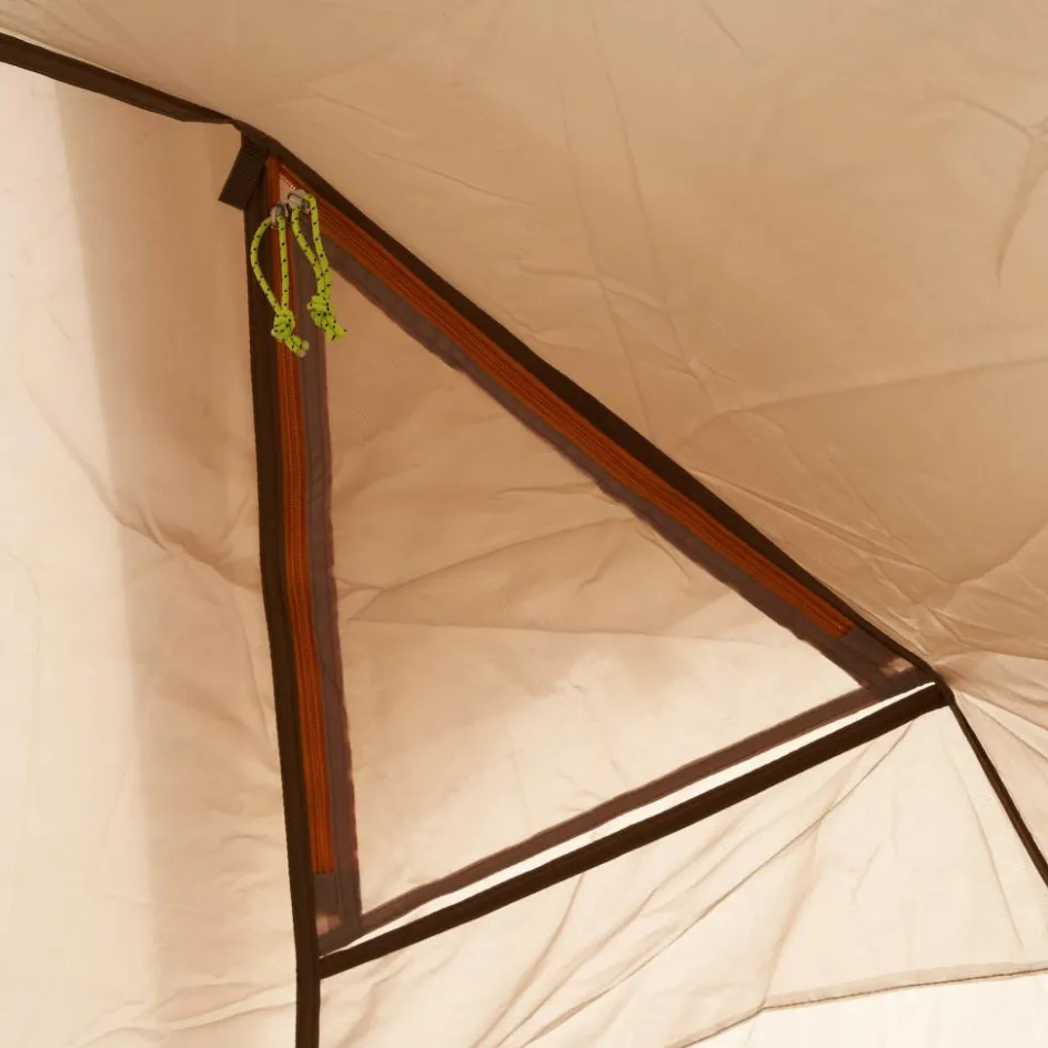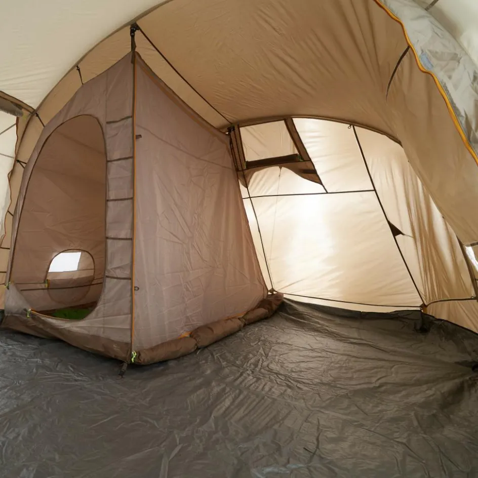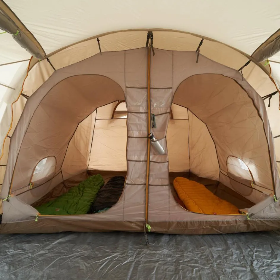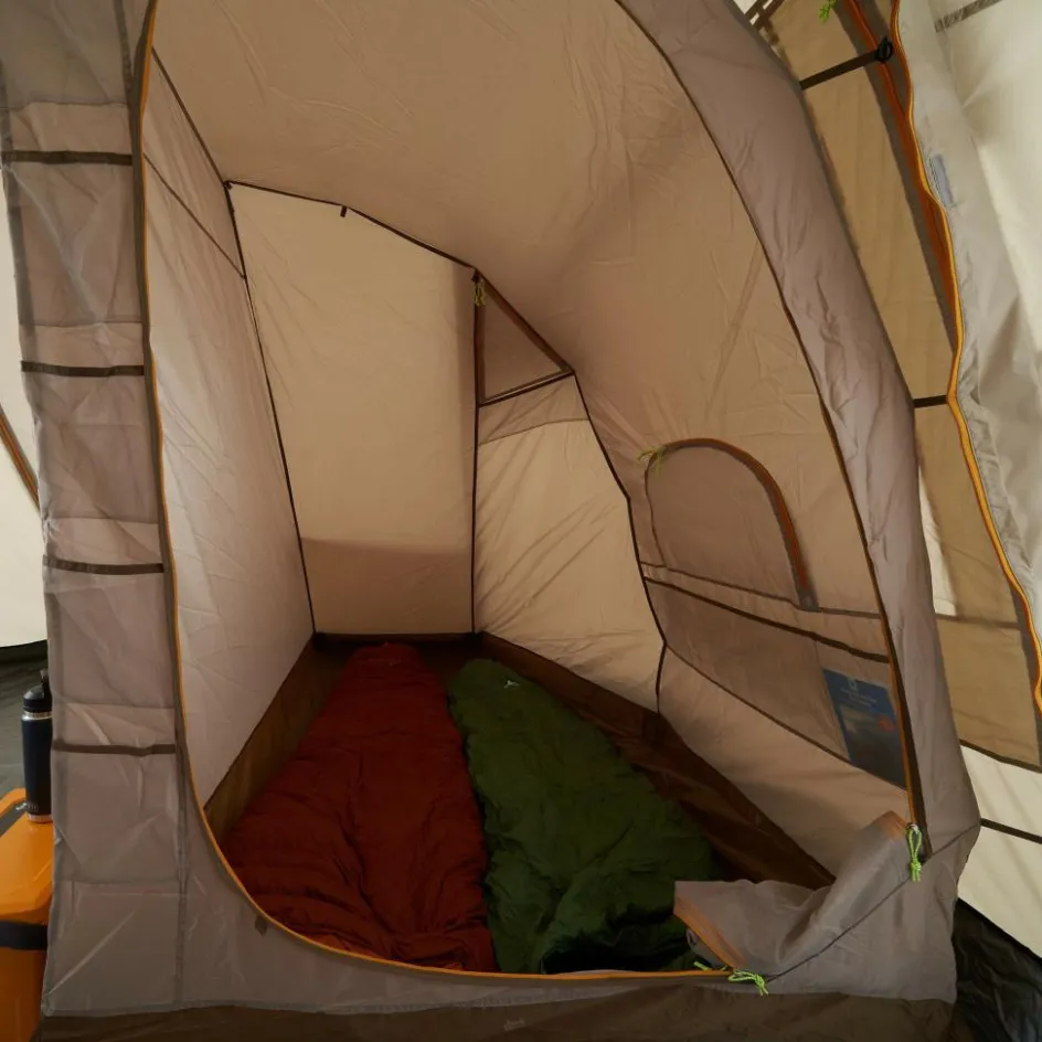 Hier fällt dir die Decke nicht auf den Kopf. Sehr großes Familienzelt aus recyceltem Polyester mit zwei Apsiden und ausreichend Platz zum Aufstellen von Sitzgelegenheiten, Taschen oder Ausrüstung.