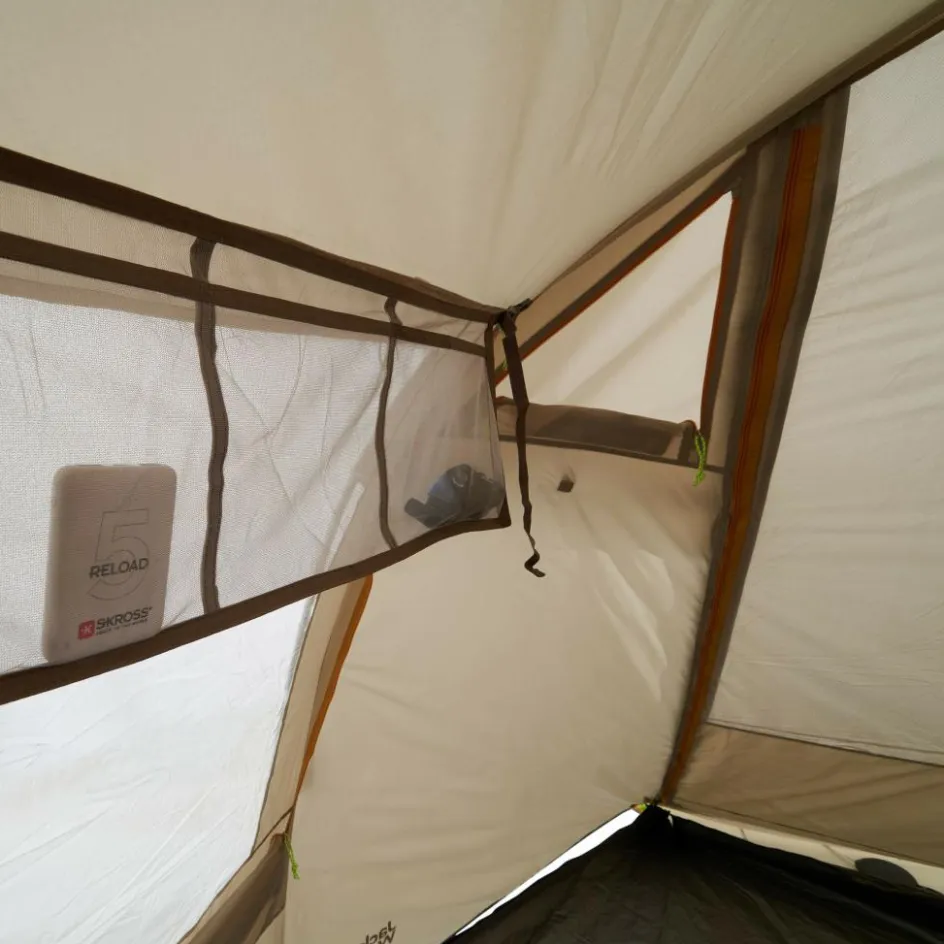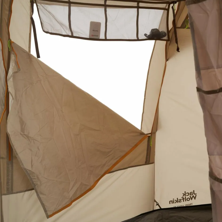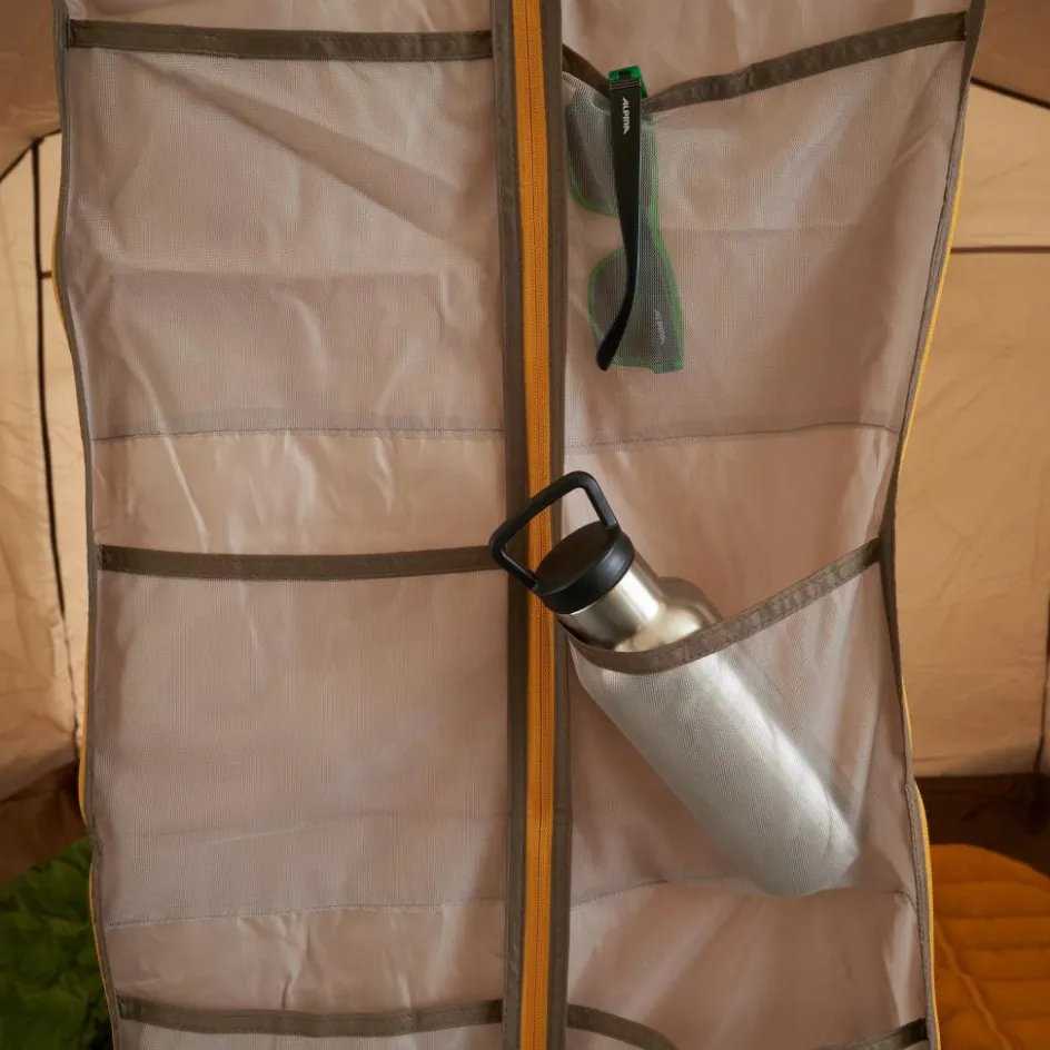 Eine fest eingenähte Bodenplane schützt das gesamte Zelt vor Feuchtigkeit und Schmutz. So kannst du auch sockfuß durch die L-förmige Apsis laufen. In dieser sorgen sage und schreibe 19 Ausrüstungstaschen für Ordnung im Campingequipment. Spiele, Sonnencreme, Reiselektüre, Insektenstichheiler, Lampen und Sonnenbrillen finden hier einen geordneten und übersichtlichen Platz.