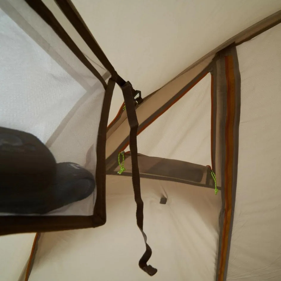 Aber auch in den Schlafkabinen wird’s nicht unordentlich. 3-4 Netztaschen je Kabine und eine Wäscheleine stehen dir zur Verfügung. In den zahlreichen Schlaufen kannst du Zeltlaternen aufhängen, um nachts nicht im Dunkeln zu stehen.