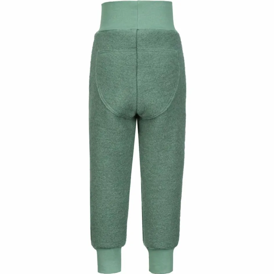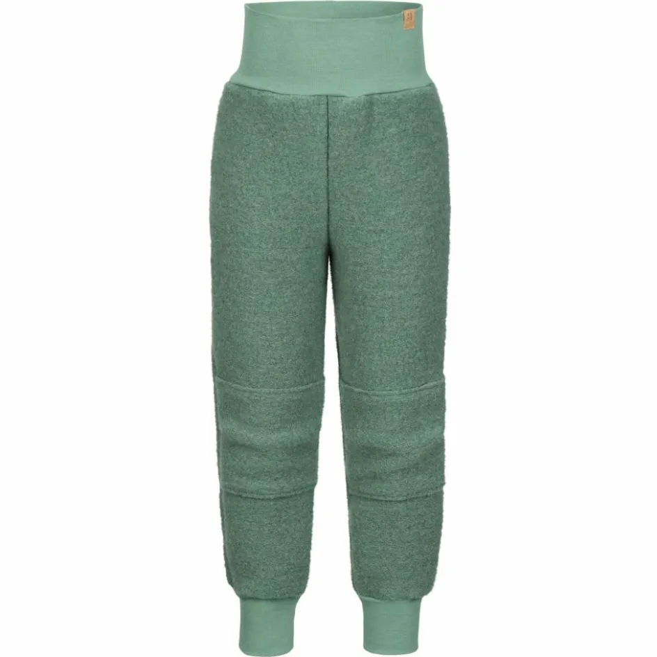 Durch die Walk-Struktur wird die Körperwärme gut eingeschlossen, so hält die Hose bei kühlem Wetter angenehm warm. Dank des hohen Anteils an Schurwolle (aus artgerechter Tierhaltung) wirkt das Material außerdem feuchtigkeitsleitend und temperaturregulierend. Weiterer Vorteil: Wolle wärmt auch im feuchten Zustand. So ist es nicht weiter schlimm, wenn die Hose einen kleinen Schauer abbekommen hat oder beim Spielen auf nassen Untergründen feucht geworden ist. Die Wolle wurde mit Baumwolle kombiniert, dadurch hat die Hose einen weicheren Griff. Das dehnbare Material, der lockere Schnitt mit vorgeformten Kniepartien und die stark elastischen Bündchen sorgen für einen besonders bequemen Sitz und uneingeschränkte Bewegungsfreiheit.