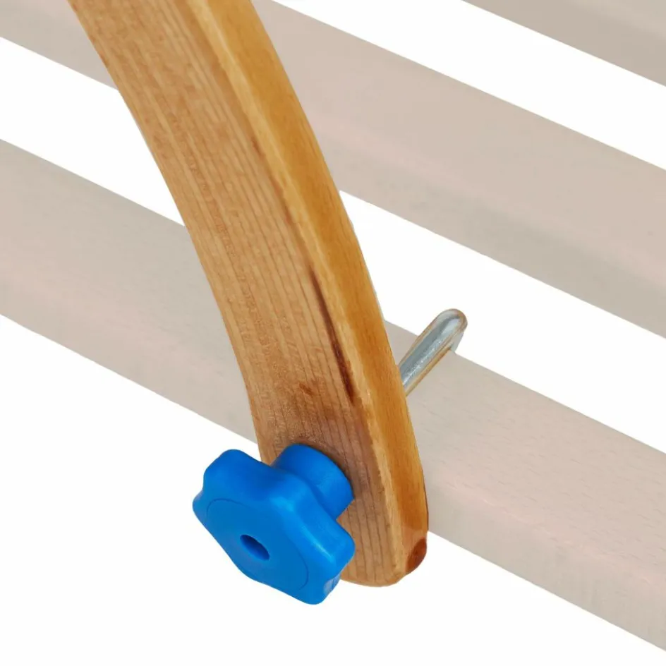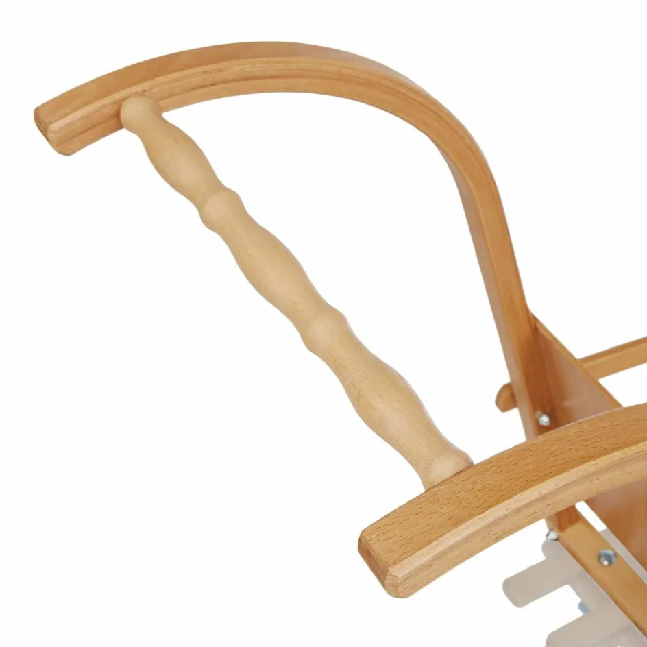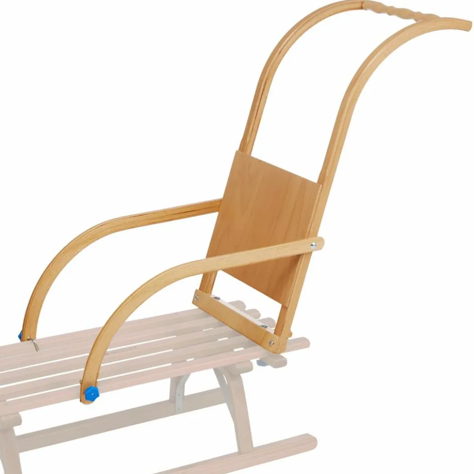 Gefertigt wird die Lehne aus versiegeltem Buchen-Formholz mit einem gedrechselten, ergonomischen Griff. Die Befestigung am Schlitten erfolgt über Schraubhaken mit Kunststoffgriffen.