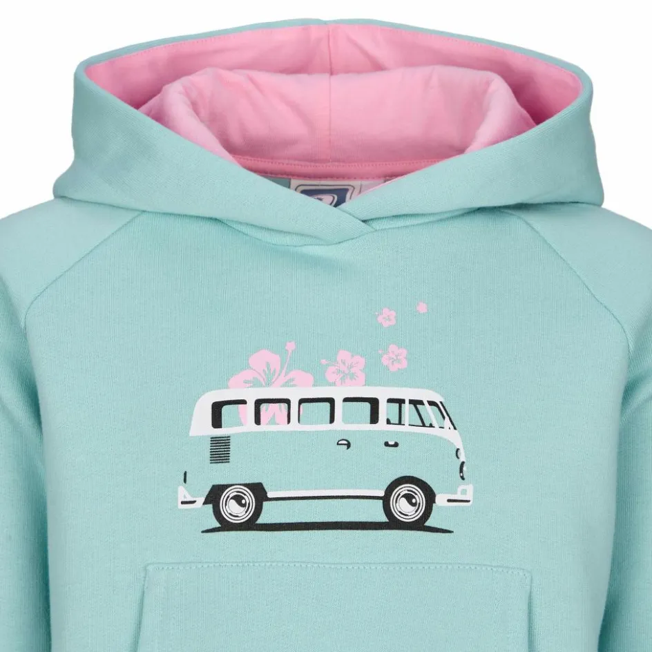Einen Teil seines charmanten Äußeren verdank das Sweatshirt dem liebevollen Bulli-Print auf dem Rücken. Die breiten Rippstrickbündchen und die praktische Kängurutasche sind eine bequeme Ergänzung. Die im Inneren farblich hübsch abgesetzte Kapuze mit Kordelzug vervollständigt das Blumenbouquet gekonnt.