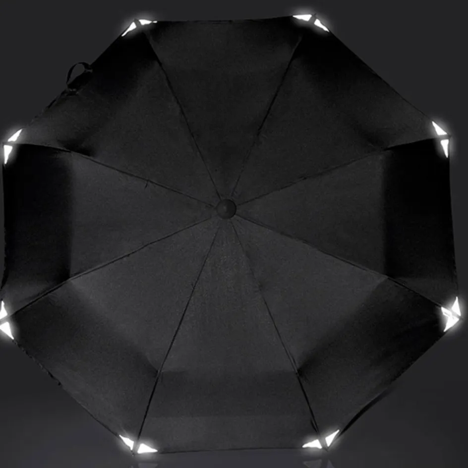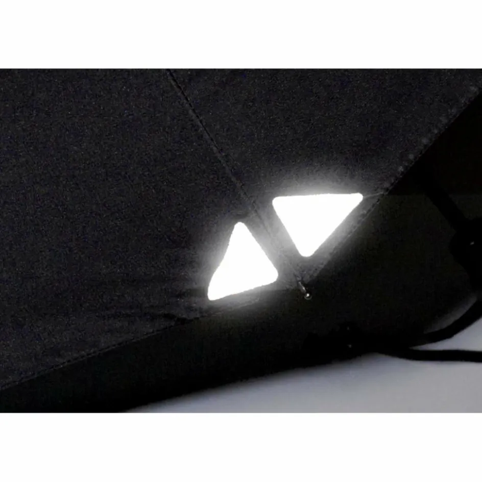Der Schirm besitzt an jedem Segment reflektierende Elemente die auch aus weiter Entfernung gut sichtbar sind. Das ist besonders bei schlechter Sicht enorm hilfreich und erhöht die Sicherheit im Straßenverkehr. Natürlich lässt er sich dadurch auch im dunklen Rucksack schneller finden.