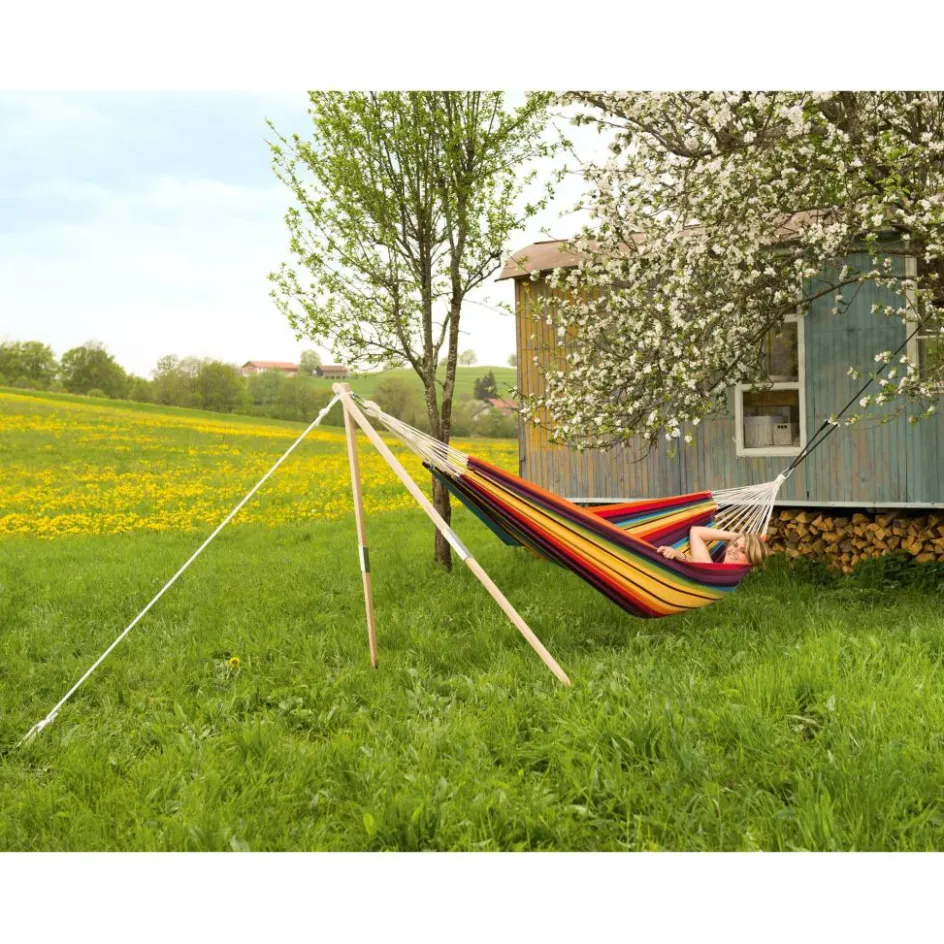 Das Gestell Madera macht dir die Nutzung deiner Hängematte sehr viel einfacher und unabhängiger. Ein Baum, ein fester (Zaun-)Pfosten oder Ähnliches reicht dir zukünftig aus, um dich gemütlich in deine Hängematte zu legen. Das Hängemattengestell Madera ist so ausgelegt, dass es sich mit allen Amazonas-Hängematten kombinieren lässt. Das Gestell lässt sich auch klein zusammenlegen und dadurch gut transportieren.