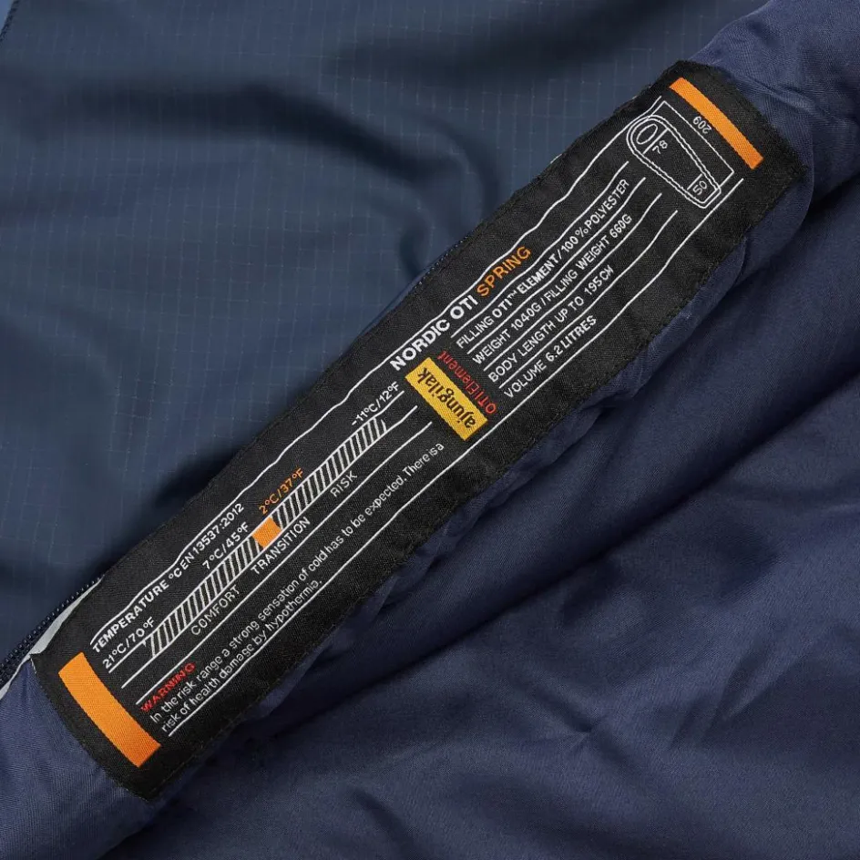 Der preiswerte Nordic OTI Spring ist ein einfacher, aber komfortabler Kunstfaserschlafsack. Das Außenmaterial aus Ripstop–Polyester ist feuchtigkeitsunempfindlich und trocknet in der Sonne durch sein dunkles Material schneller als andere Modelle mit hellen Stoffen.