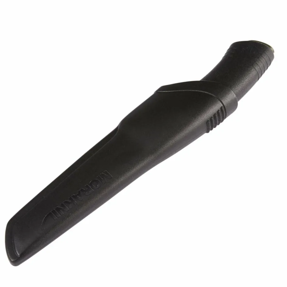 Die schwarze Kunststoffscheide ist mit einer vergrößerten Öffnung (für einfaches Einstecken) und einer flexiblen Gürtelschlaufe (so stört die Scheide beim Gehen nicht)ausgestattet. Messer wie Scheide lassen sich dank des pflegeleichten Materials nach Gebrauch einfach abspülen.