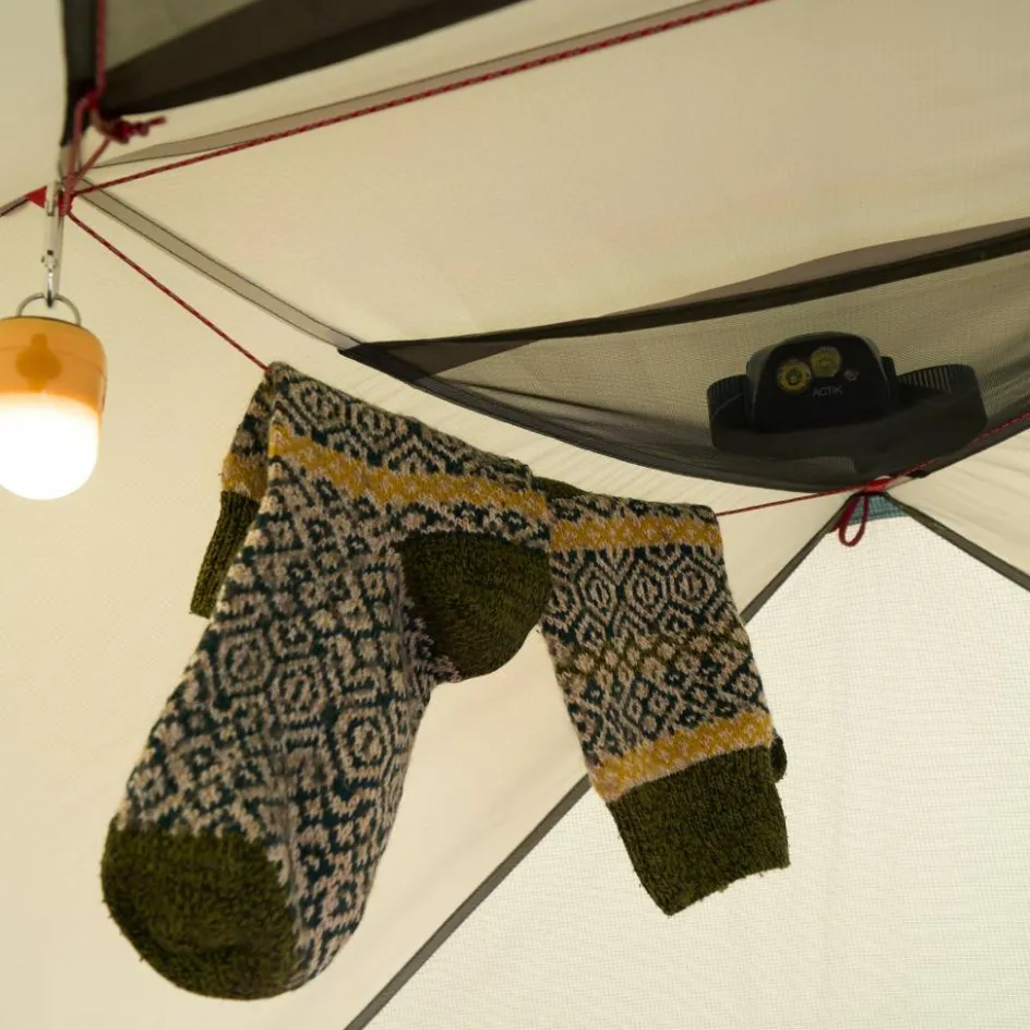 Im Innenraum stehen dir vier Schlaufen zur Verfügung, etwa zum Aufhängen einer Zeltlaterne. Im Deckenbereich befindet sich eine Wäscheleine, auf der du Kleidung zum Lüften oder trocknen hängen kannst. Ergänzt wird das Stauraumangebot durch mehrere Netztaschen. Zwei kleinere befinden sich im Deckenbereich, vier große im Kopf- und Fußbereich. So bringst deine Ausrüstung übersichtlich unter.