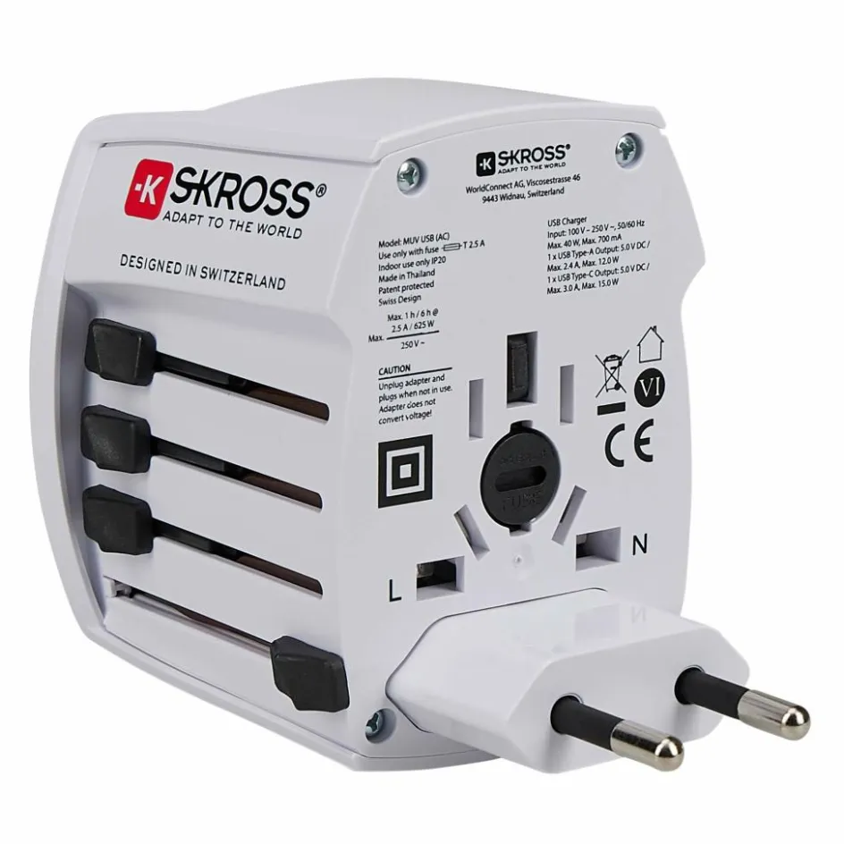 Der MUV USB Adapter kann in mehr als 200 Destinationen verwendet werden und bietet einen USB-A und USB-C Anschluss sowie einen Anschluss für ungeerdete Geräte.