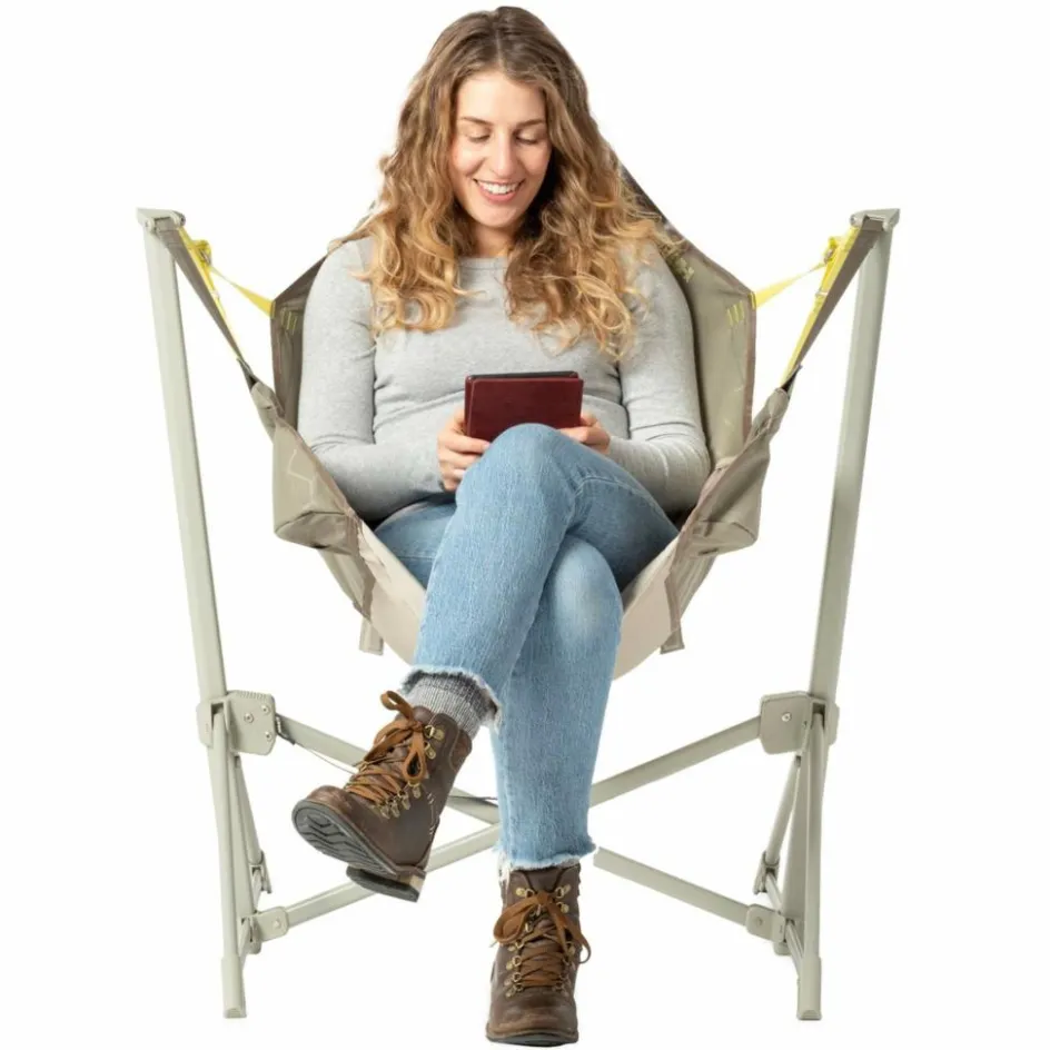 Durch die ausgefeilte Technikist der Aufbau des Stargaze Evo-X nun noch simpler geworden: Das Faltdesign ist so abgeändert worden, dass du den Campingstuhl in einer fließenden Bewegung auffalten und dann mit Druck deines Fußes einfach arretieren kannst. Mehr ist nicht nötig, um in den Genuss des schwebend-schaukelnden Sitzens beim Stargaze Evo-X zu gelangen.