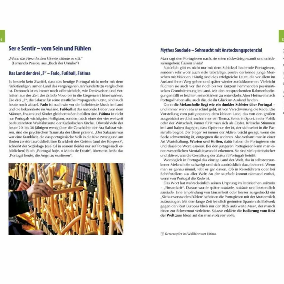 Das kleine Portugal schaut mit Wehmut zurück auf ein verlorenes Weltreich – doch was ist mit Heute und Morgen? Warum sind die Portugiesen überzeugte Europäer und empfinden sich dennoch als Exoten in Europa? Wovon und wie leben die Menschen? Das vermeintlich bekannte Reiseziel (Algarve, Lissabon, Porto, Coimbra,.) präsentiert sich bei näherem Blick ganz anders als erwartet, vor allem überaus spannend.