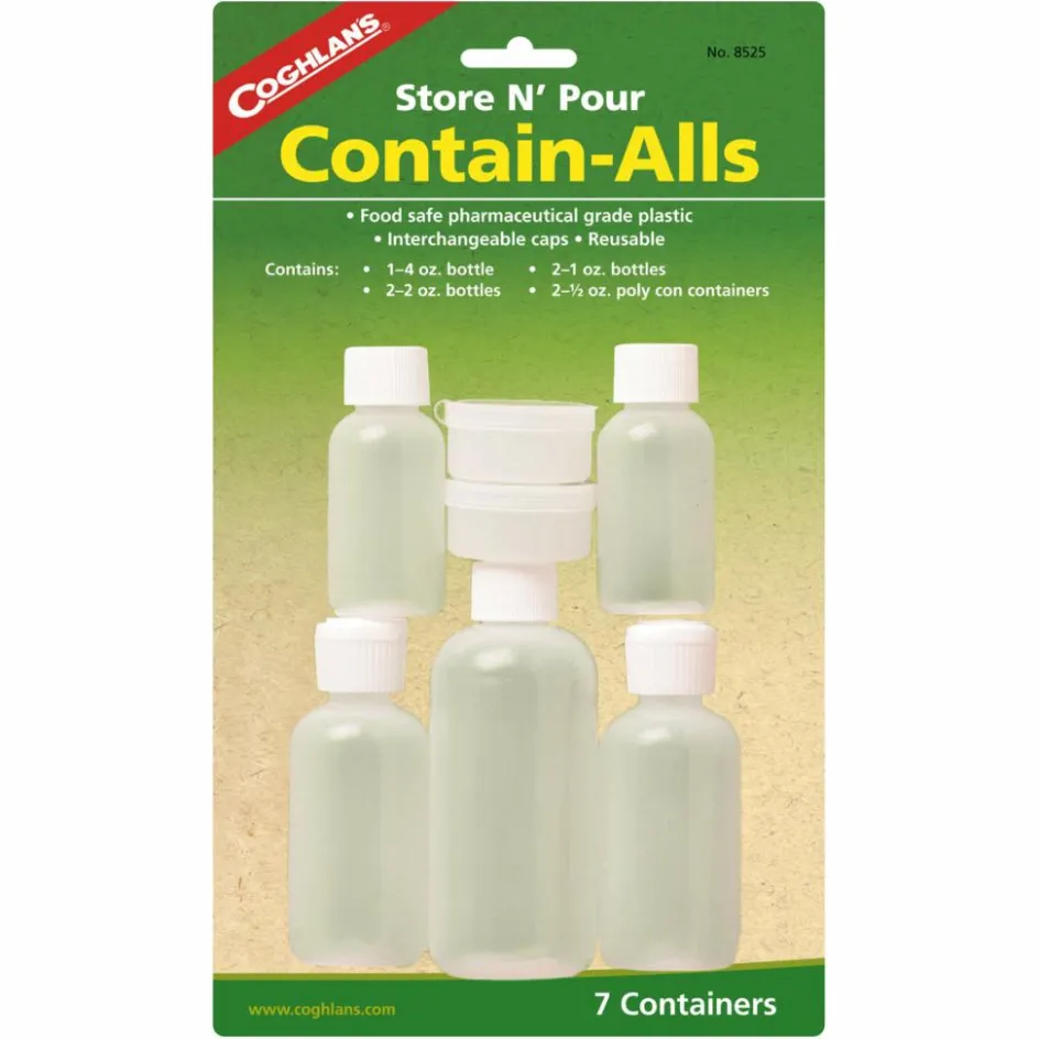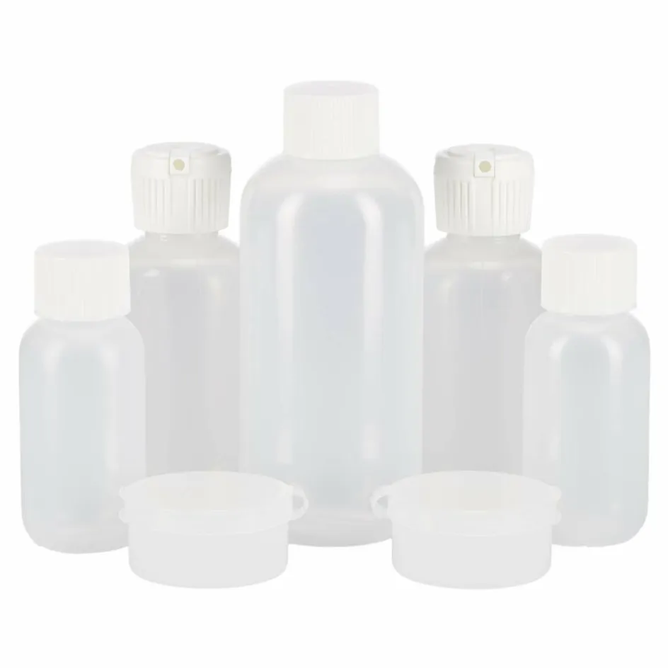 Universelles Set aus verschieden großen Kunststoffflaschen und Dosen für Lebensmittel, Medizin, Kontaktlinsenflüssigkeit etc. Die Behälter sind Handgepäckgeeignet.