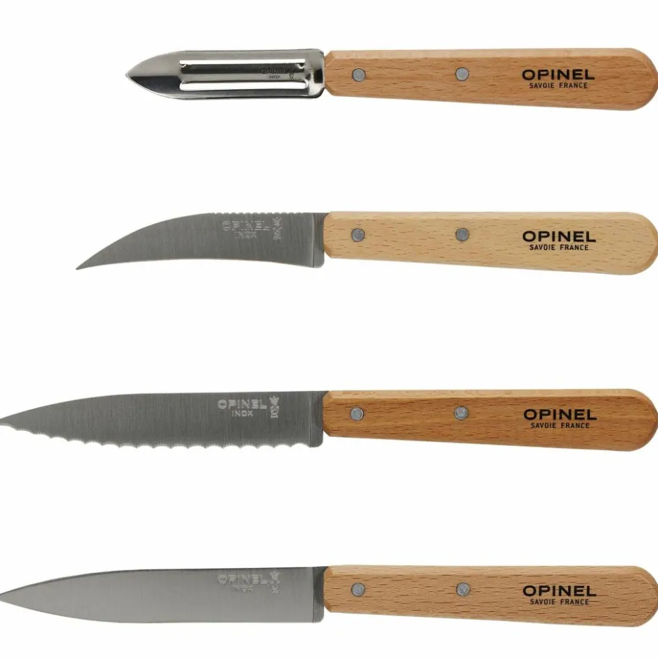 Alle Modelle verfügen über einen Griff aus Buchenholz und eine Klinge aus rostfreiem Inox-Stahl. Das Set besteht aus folgenden Opinel-Modellen: