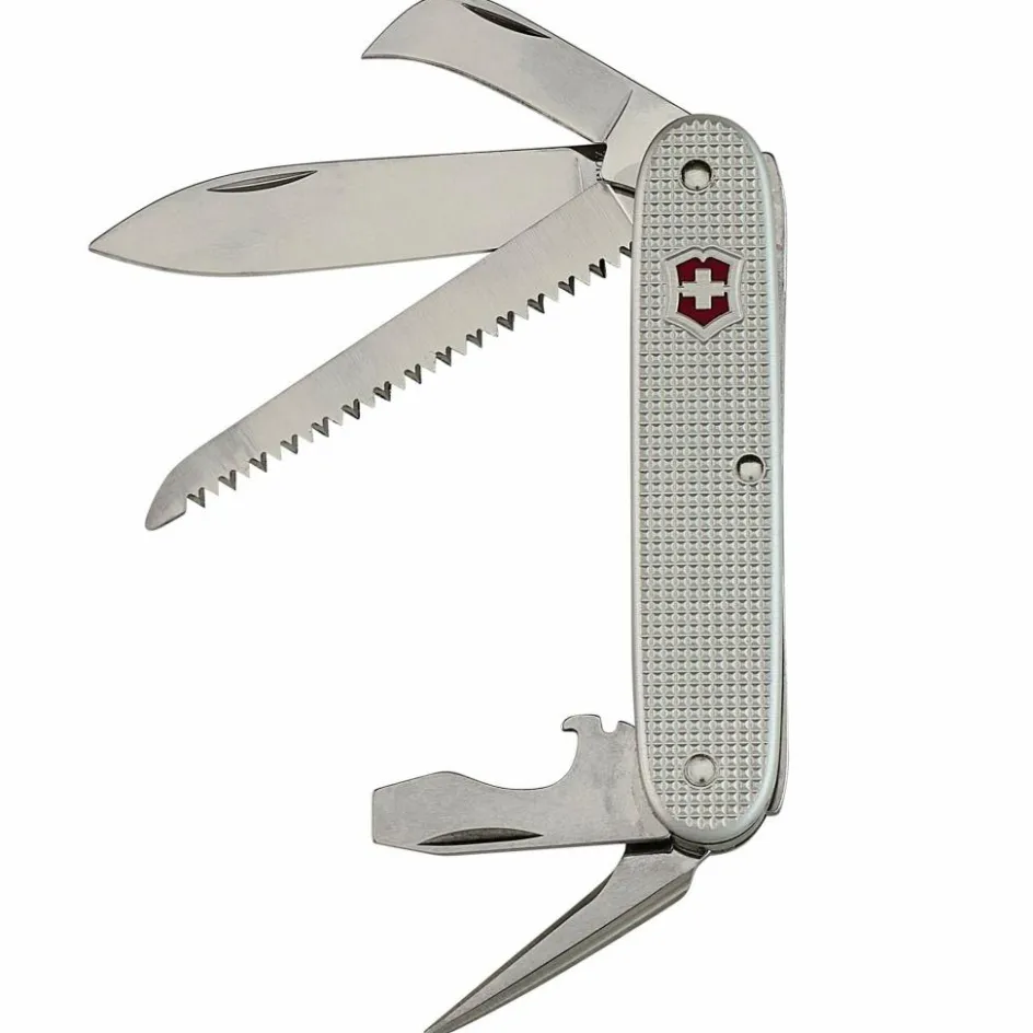 Das Schweizer Taschenmesser enthält unter anderem eine mittelgroße Klinge, eine Holzsäge und eine Hakenklinge, die sich hervorragend zum Öffnen von Kartons oder zum Durchtrennen von Seilen eignet.
