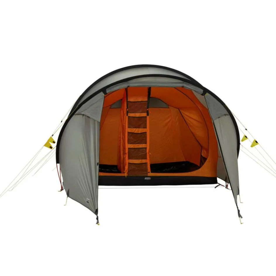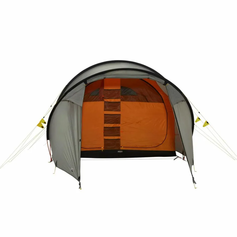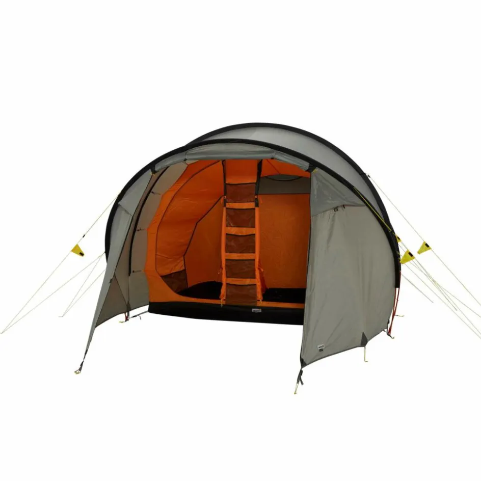 Tunnelzelt mit 180 cm Stehhöhe, das 3-4 Personen Platz bietet. Es eignet sich gut für kleine Familien und hat in der Apsis genügend Fläche für einen Tisch mit Stühlen.