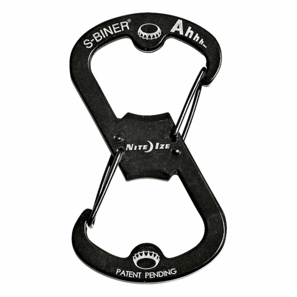 Praktischer Doppel-Karabiner mit Flaschenöffner-Funktion, aus Edelstahl.