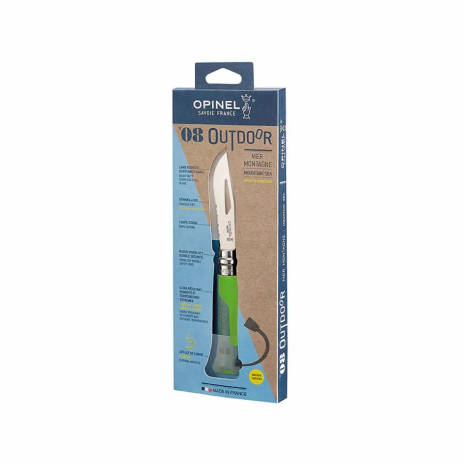 Die Teilzahnung der Klinge ermöglicht das Durchtrennen von Seilen aus Natur- und Kunstfaser. Der Griff ist aus robustem, glasfaserverstärktem -Material aufgebaut. Im Griff ist eine Signalpfeife eingelassen, mit der sich ein 110 Dezibel lauter, weithin hörbarer Ton erzeugen lässt. Mit der Kunststoff-Kordel lässt sich das Outdoor an vielen Orten befestigen.