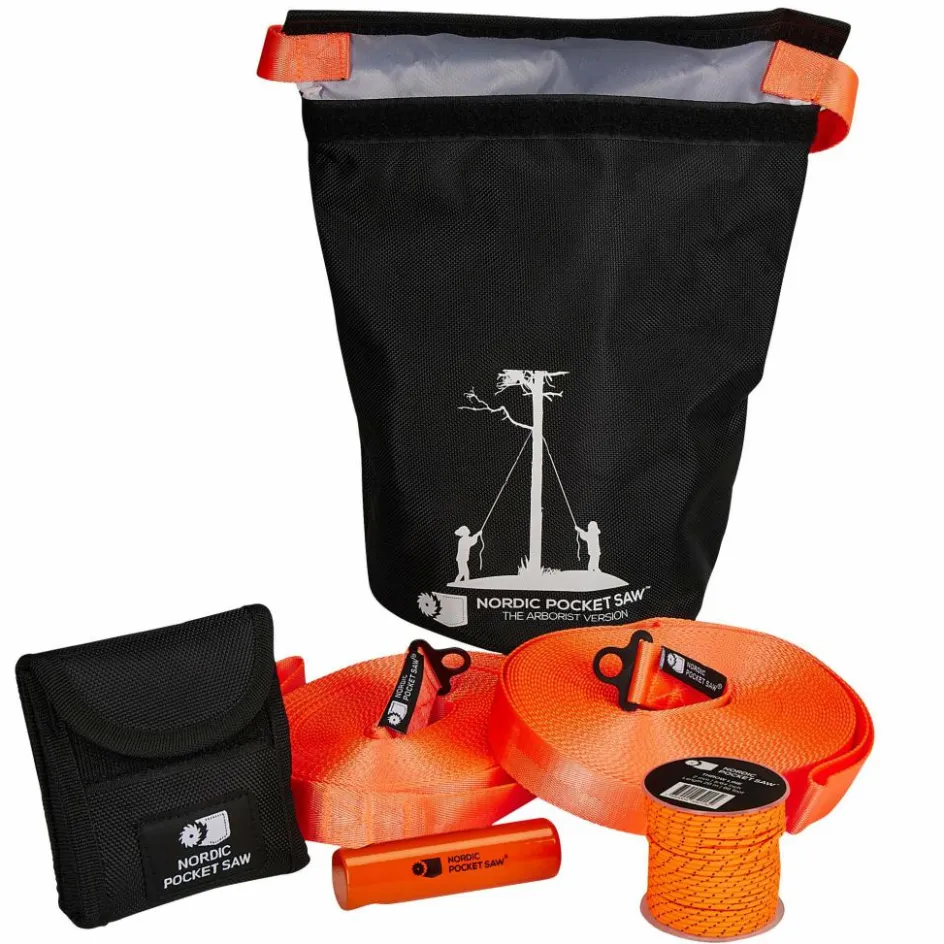 Packbare Wurfkettensäge mit allem, was du brauchst, um hohe, schwer erreichbare Äste abzusägen. Die Säge ist an Gurten befestigt und bringt eine Wurfleine mit. Sägen ohne Leiter und ohne zu klettern!