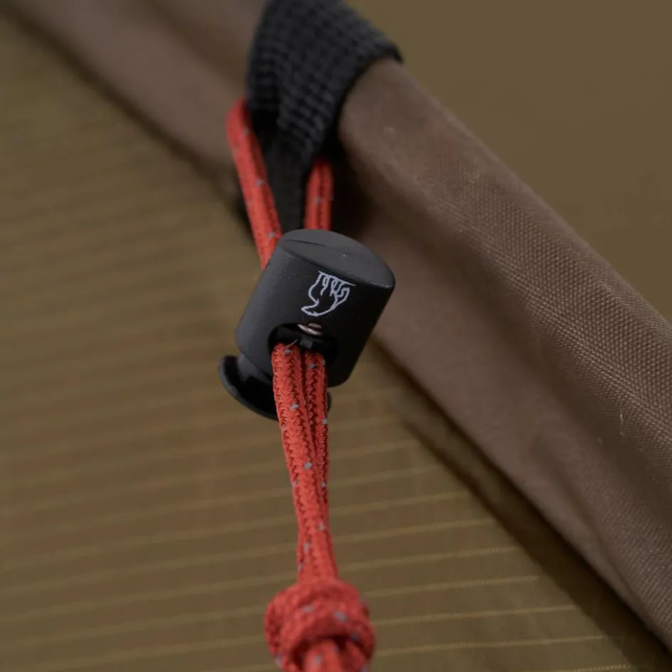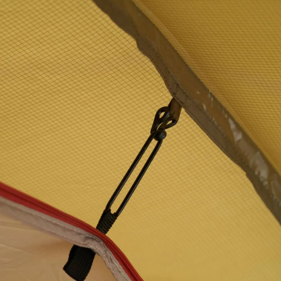 Die Gestängebögen sind unterschiedlich lang. Dadurch entsteht eine nach vorne und hinten abfallende Form, die stabiler im Wind steht und das Gesamtgewicht reduziert. Für frische Luftzufuhr sorgen die beiden Lüfter an den Stirnseiten. Sie sind mit einem Moskitonetz ausgestattet, welches unliebsame Bewohner draußen hält.