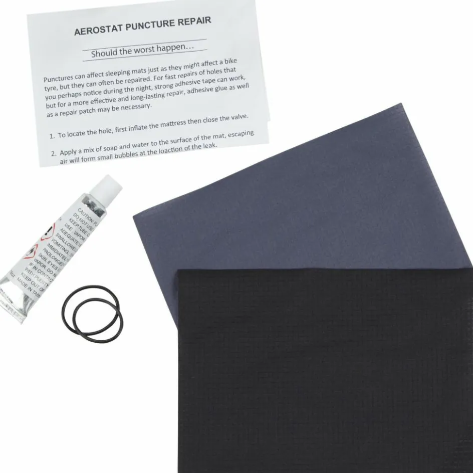Das Set enthält verschiedene Flicken für die Außen- und Innenseite deiner Matte, Klebstoff sowie Ersatz-O-Ringe. Damit bist du vorbereitet, falls unterwegs doch einmal ein Schaden auftritt.