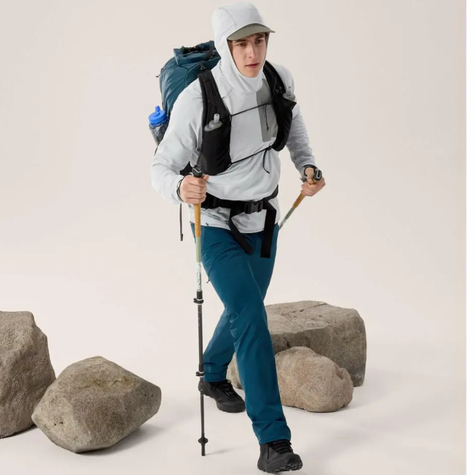 Eine dezente, aufgeräumte Ausstattung, die aufs Wesentliche reduziert ist, unterstützt das geringe Gewicht der Hose und sorgt für Komfort. So macht sich der integrierte Gürtel selbst unter einem Klettergurt oder Rucksackhüftgurt nicht bemerkbar. Die Beinabschlüsse lassen sich dank Kordelzug zusammenziehen, sodass du den nächsten Tritt immer im Blick hast. Drei Reißverschlusstaschen bieten sicheren Stauraum für Schlüssel, Riegel und Co.