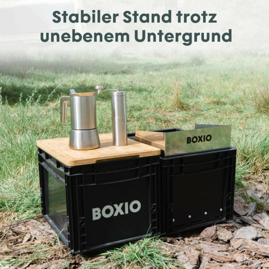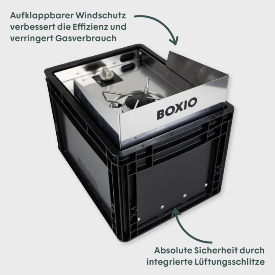 Die leistungsstarke Gasflamme bietet dir eine zuverlässige Hitzequelle und lässt sich stufenlos regulieren. Mit einer handelsüblichen EN 417 Gaskartusche (500 g) kannst du bis zu 30 Mahlzeiten zubereiten. Das stabile Edelstahl-Gehäuse schützt die Technik und sorgt für eine hohe Langlebigkeit. Die integrierte Zündsicherung erhöht die Sicherheit beim Betrieb. Dank des kippsicheren Designs kannst du auch auf unebenem Untergrund entspannt kochen. Nach dem Einsatz verstaust du deine Kochutensilien direkt im Gerät, das sich zudem problemlos mit anderen Boxio Produkten stapeln lässt – ideal für eine aufgeräumte Ausrüstung.