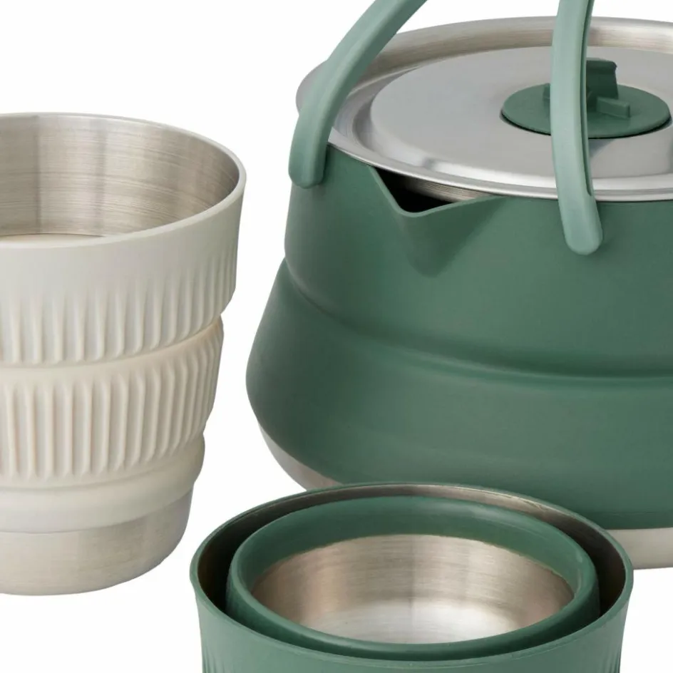 Faltbares Kaffee und Tee-Service, bestehend aus einem Faltkessel mit 1,6 l Volumen und zwei Faltbechern mit 475 ml Volumen. Alle Teile können platzsparend gefaltet und ineinander verstaut werden.