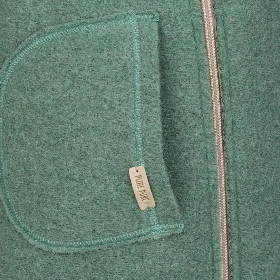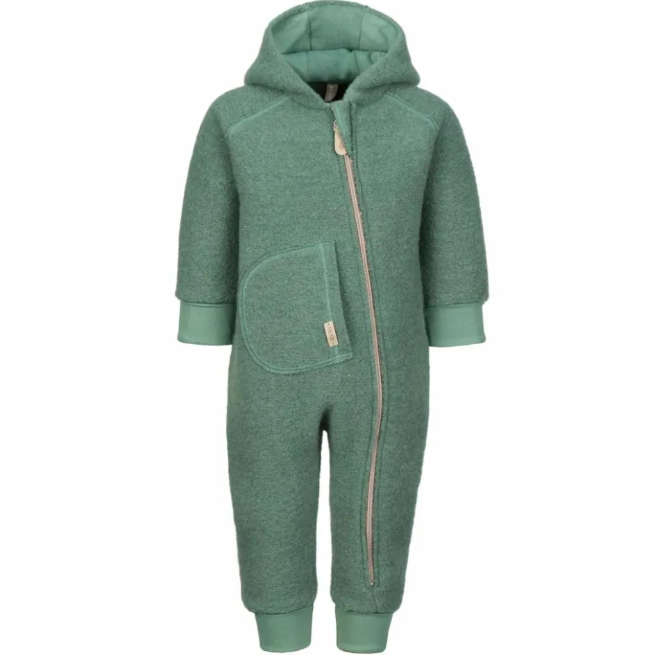 Der Overall besteht komplett aus natürlichen Materialien. Als Hauptmaterial kommt hochwertige, gewalkte Schurwolle zum Einsatz. Durch den Prozess des Walkens wird die Strapazierfähigkeit und die Wärmeleistung des Materials verstärkt. Zudem verfügt Wolle von Natur aus über eine Reihe praktischer Eigenschaften: Sie ist angenehm atmungsaktiv, geruchshemmend und wirkt temperaturausgleichend. So bleiben die Kinder schön warm, wenn sie im Kinderwagen sitzen, sie überhitzen aber auch nicht, wenn sie ausdauernd durch Wald und Wiesen stapfen. Da Wolle auch im feuchten Zustand wärmt, ist es auch nicht weiter schlimm, wenn die Kleinen mal in einen kurzen Regenschauer geraten. Dem Material ist etwas Bio-Baumwolle beigemischt, die für einen herrlich weichen Griff sorgt.
